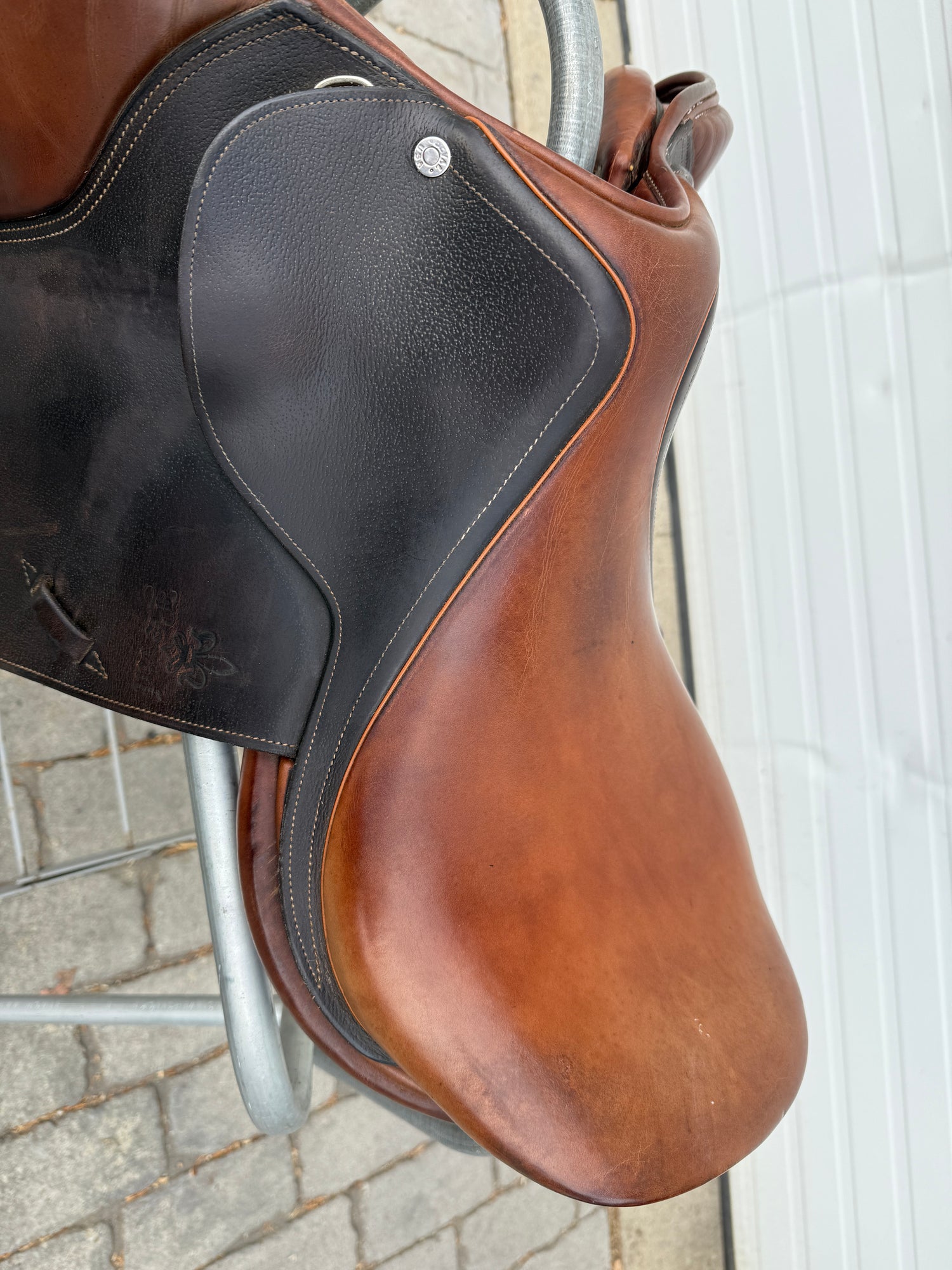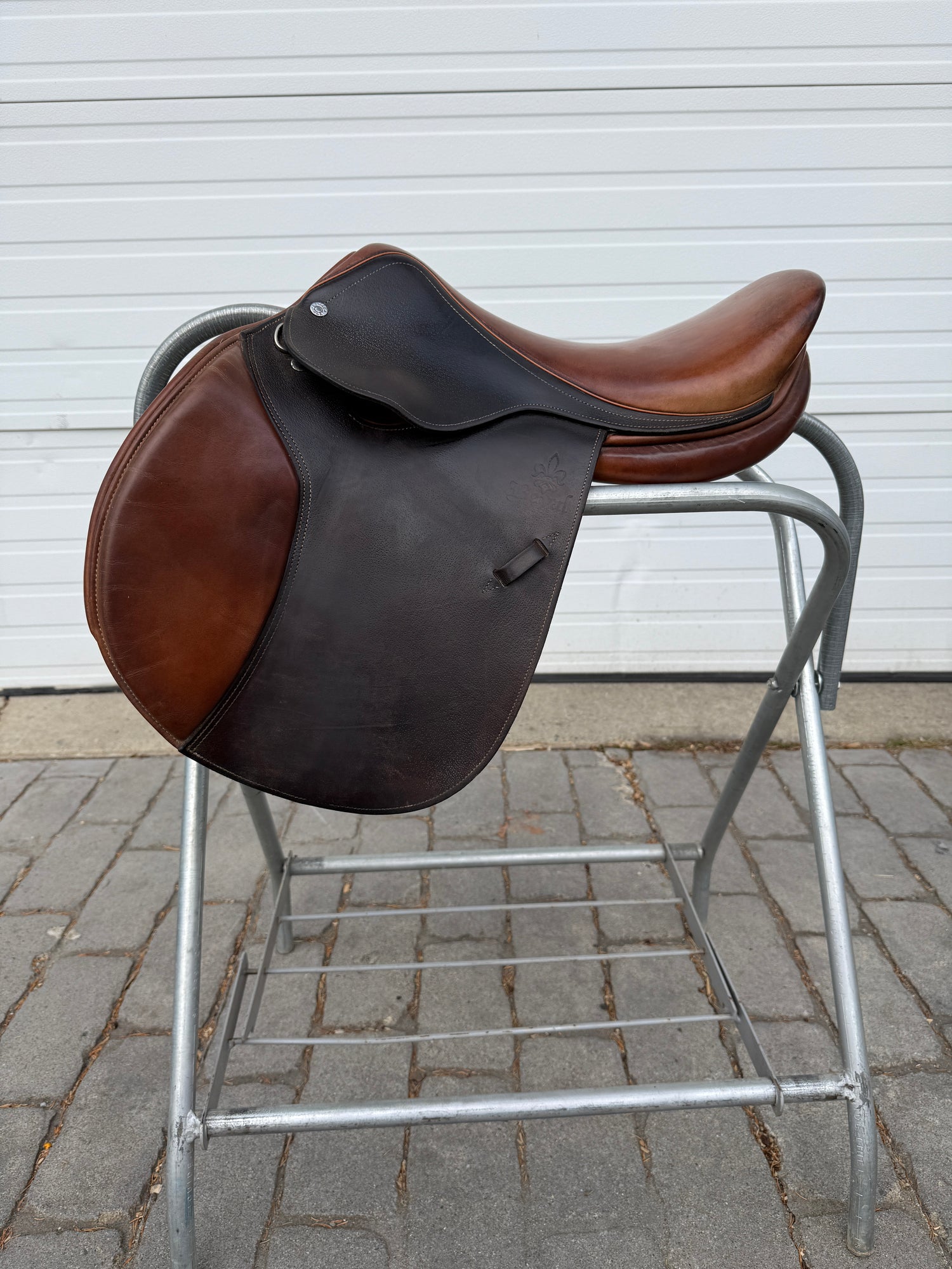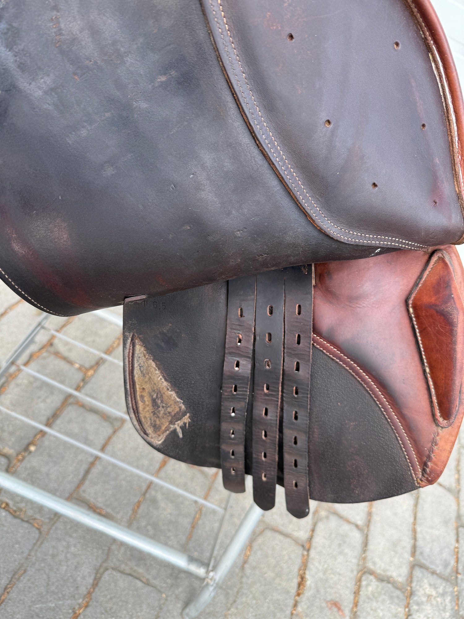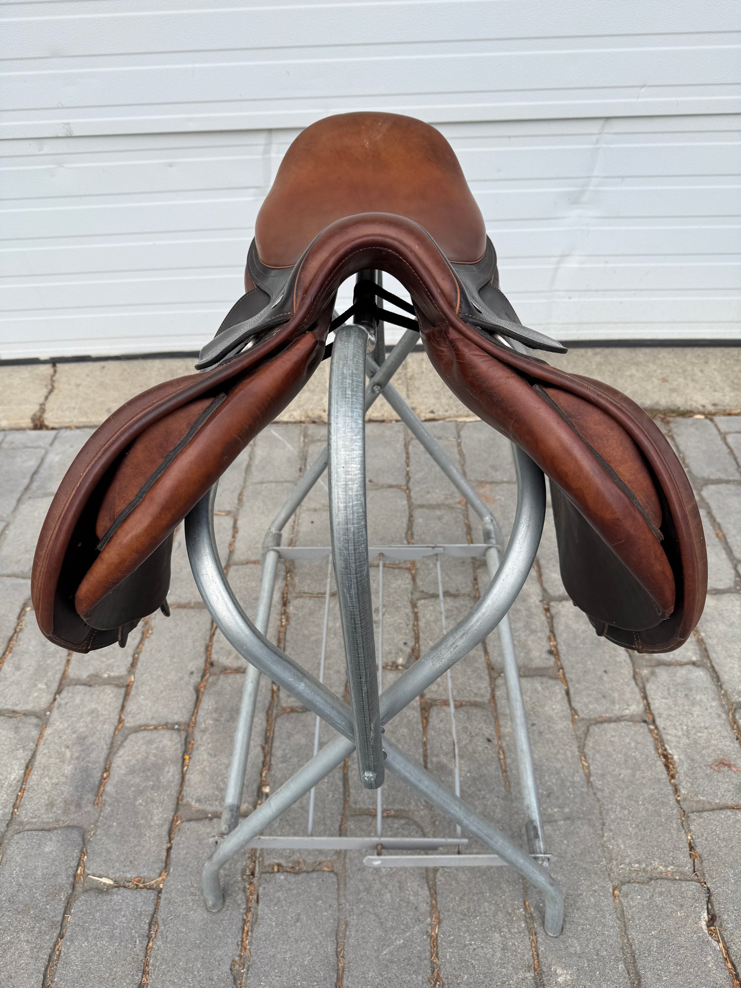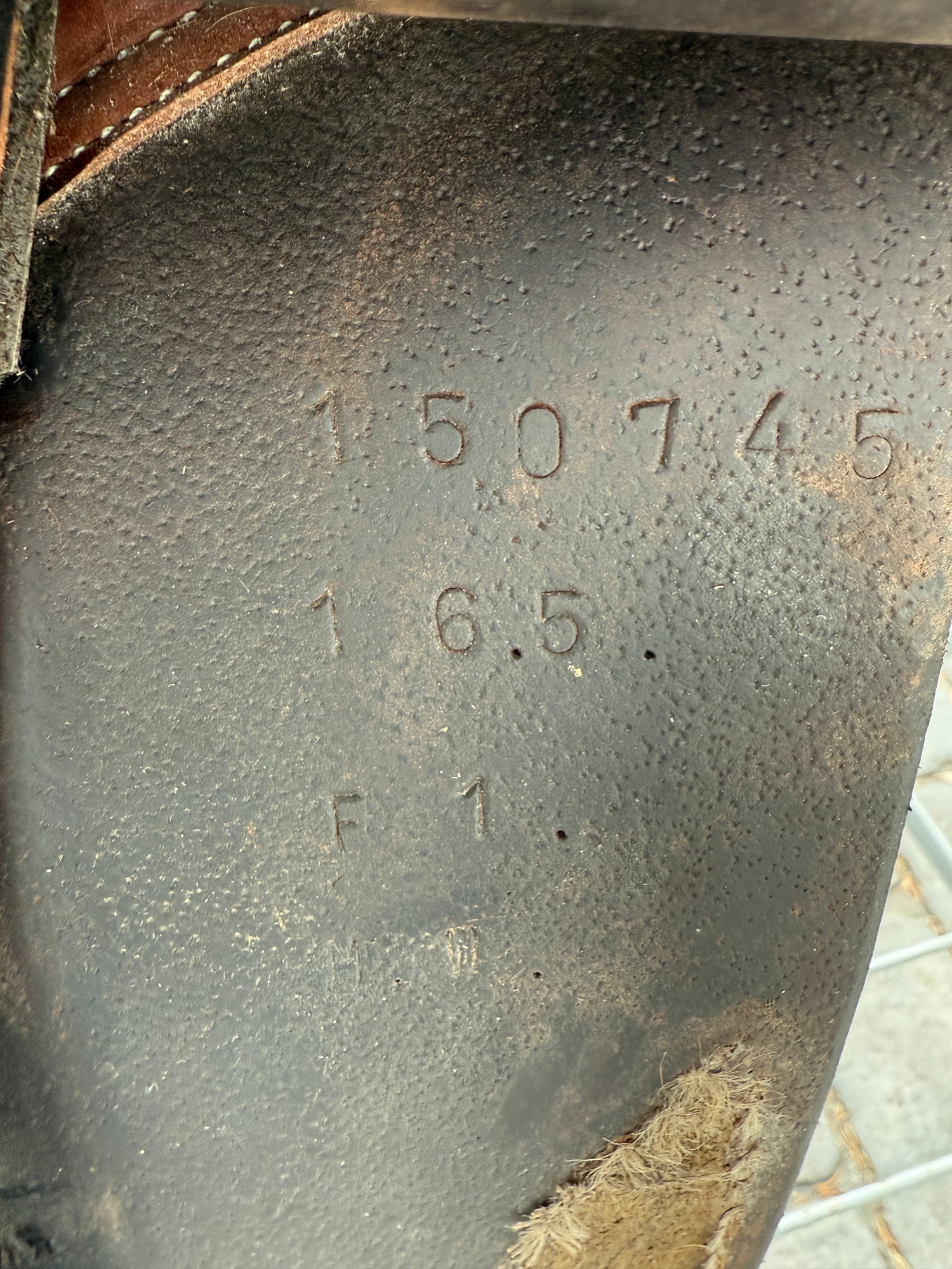 Beval Saddlery Close Contact English Saddle with a 16.5" seat. Saddle is two tone leather in color with the lighter seat and knee rolls for that classic look. Saddle features padded knee flap with front knee block. Saddle stamped on flap and buttons with maker. Saddle stamped on underside of flap with 150745 16.5 F1 M. Used, but in good condition. Saddle has normal wear on seat and flaps. Saddle has marks from use and handling. Saddle may have areas that are darker than others from use, cleaning, and time. Saddle has normal rubbing on stitching wear where leg sits. Saddle has some spider marks starting. Thigh blocks have been removed. Please see pictures for condition.