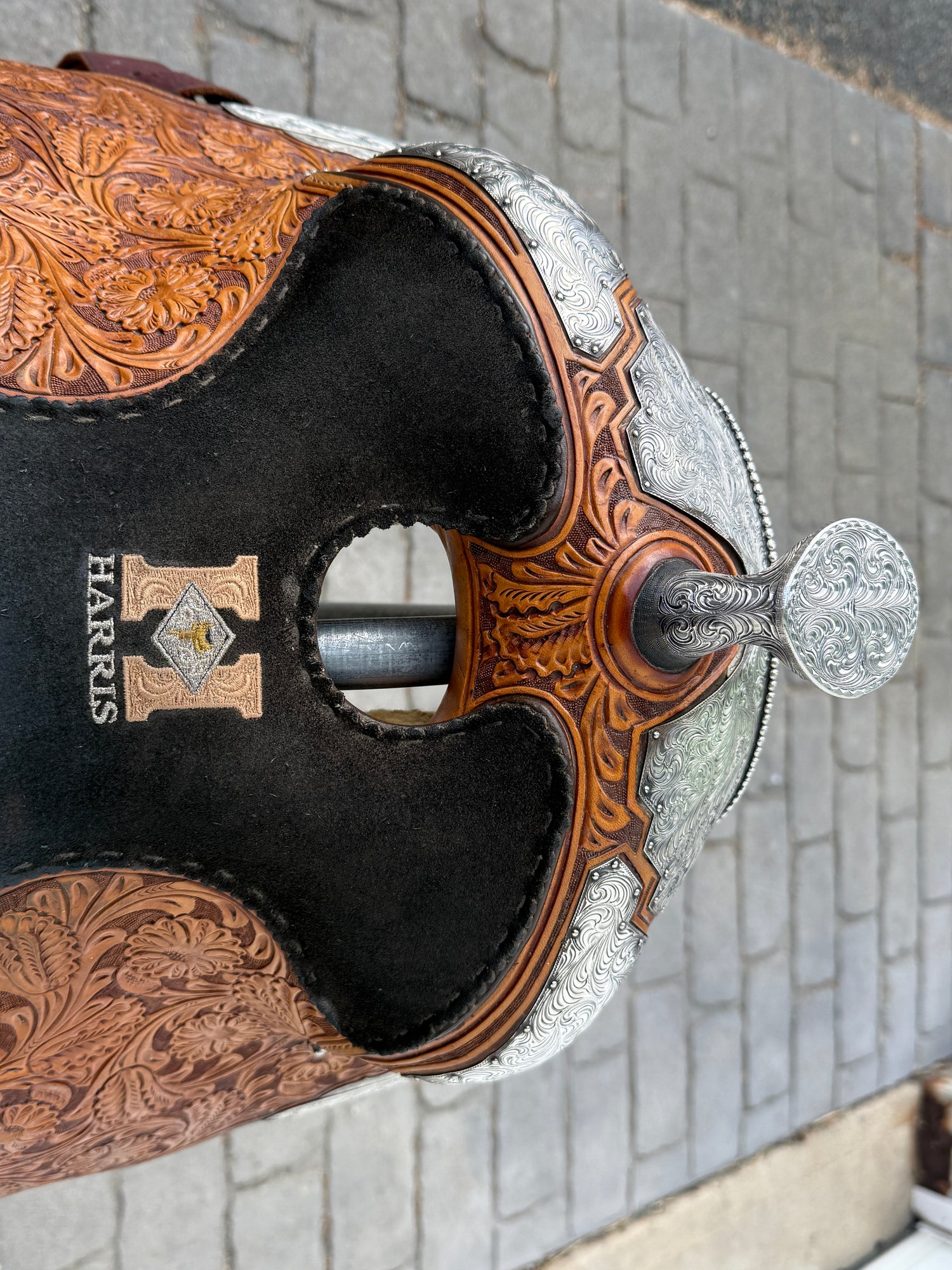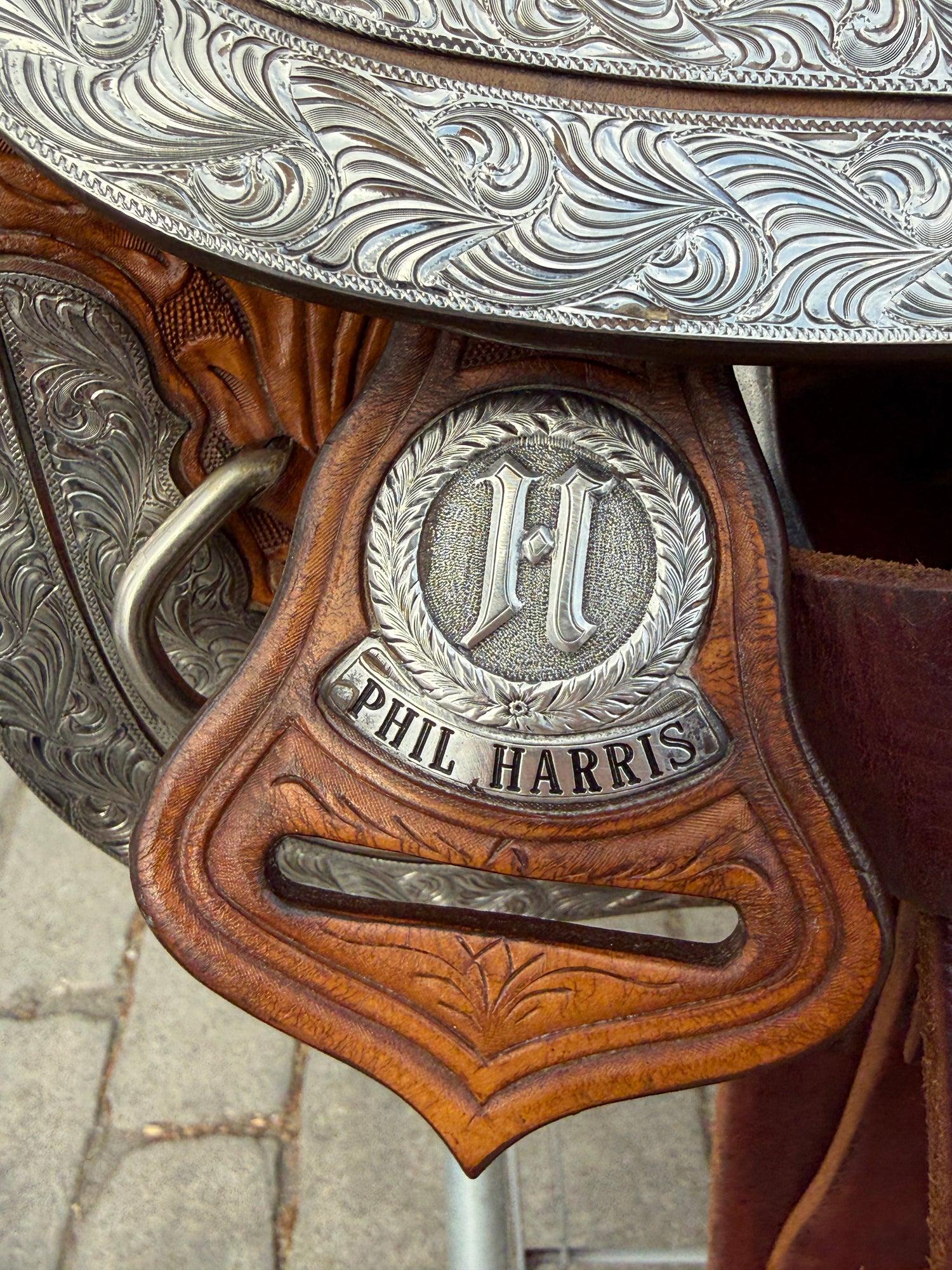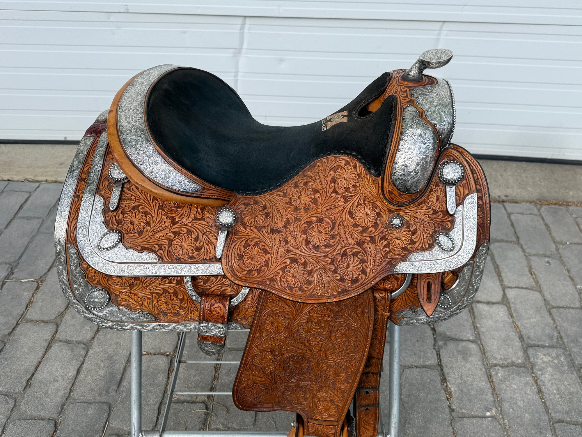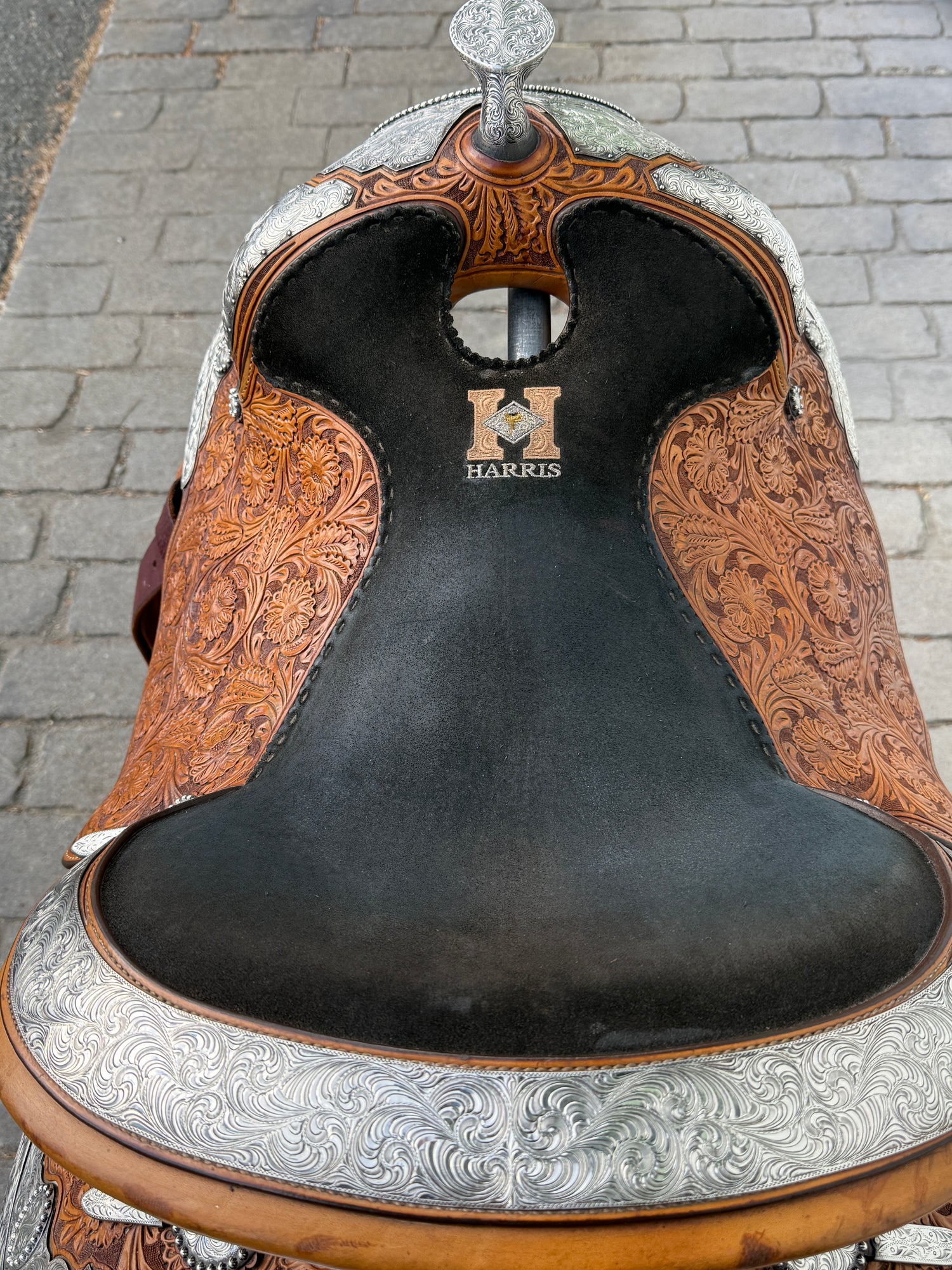 Beautiful Phil Harris custom Western Show Saddle with a 16" padded black suede seat. Saddle is originally light oil in color and features lots of silver. Saddle has eight corner plates with eight board plates trimming the corners. In addition is has three pommel plate including large front pommel plate, large cantle plate, and silver horn. Make a statement in the show pen with this fully hand tooled saddle. FQHB. Stamped with maker marks on fenders and underside of jockey along with maker plate on latigo keeper. Stamped 5320151909. Used, but in good condition. Saddle has normal wear on seat, stirrups, and fenders. Saddle may have marks from use and handling. Saddle has darkened from original color from use, time, light, and cleaning. Some areas may be darker than others. Silver may have area of tarnish. Please reference pictures for condition. Sold with Harris Saddle bag.
