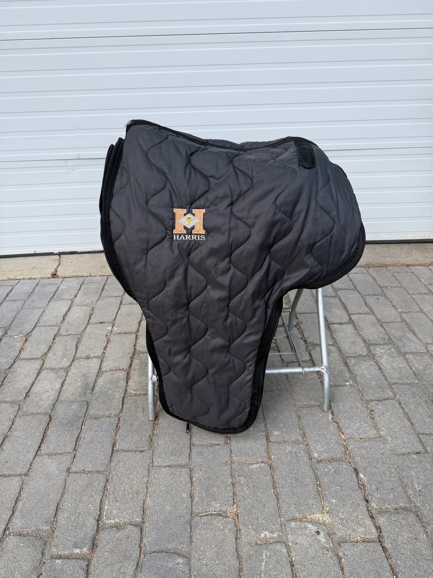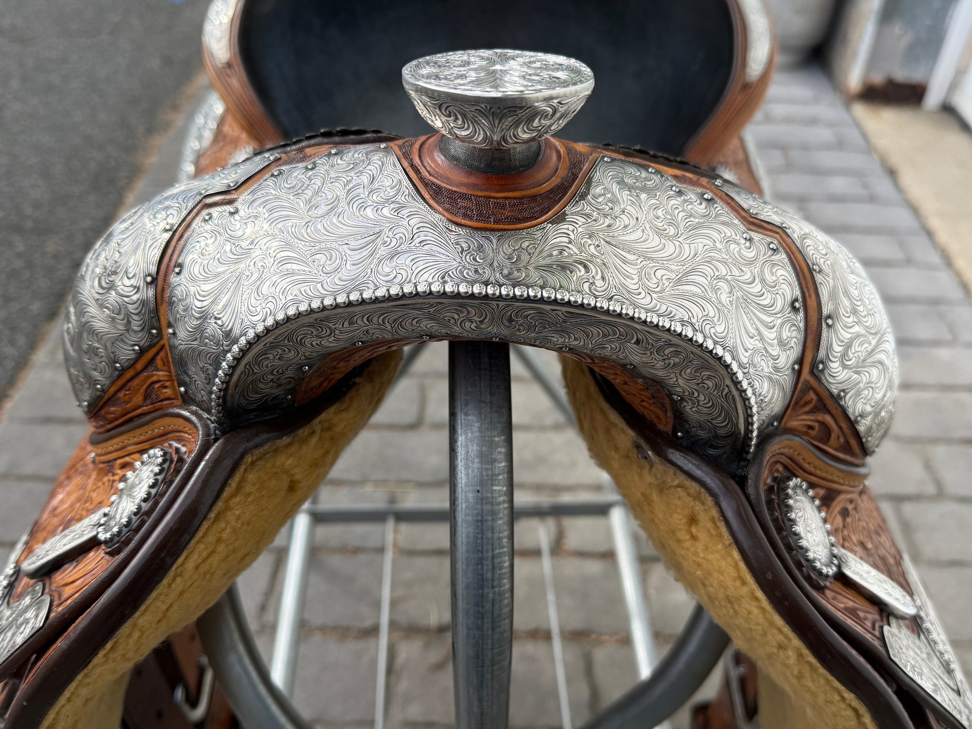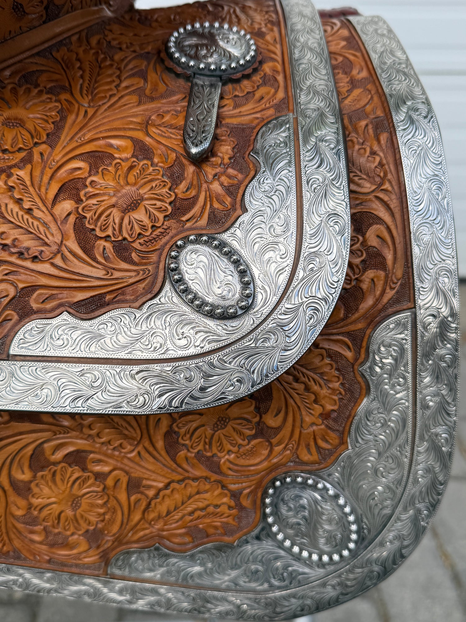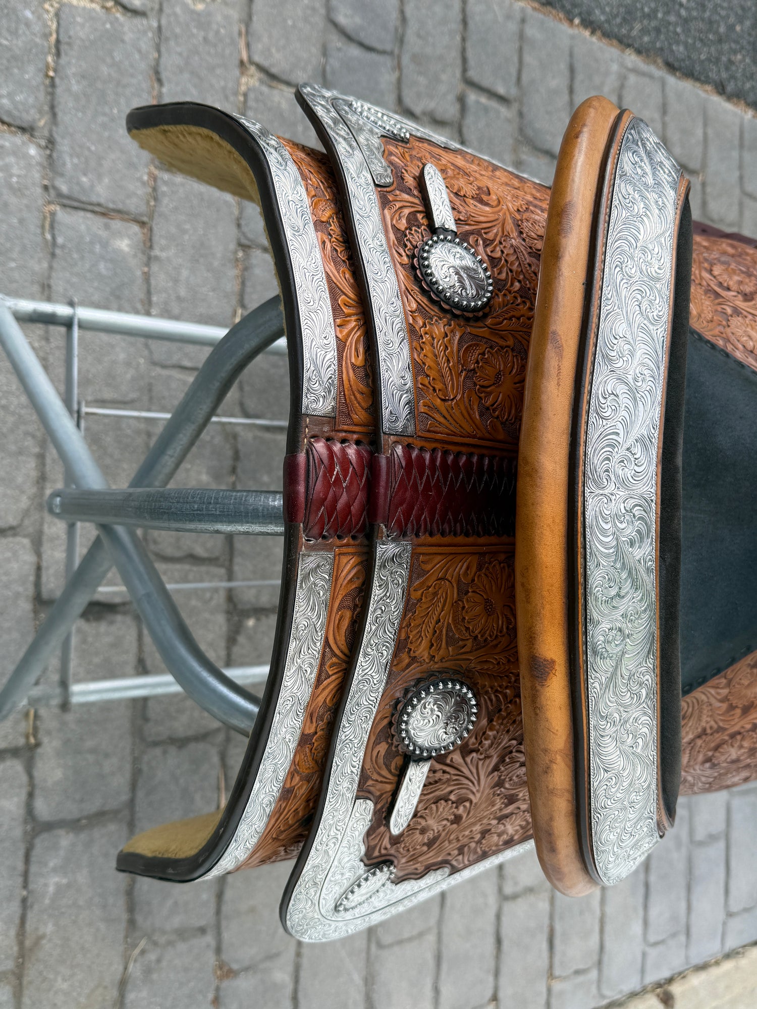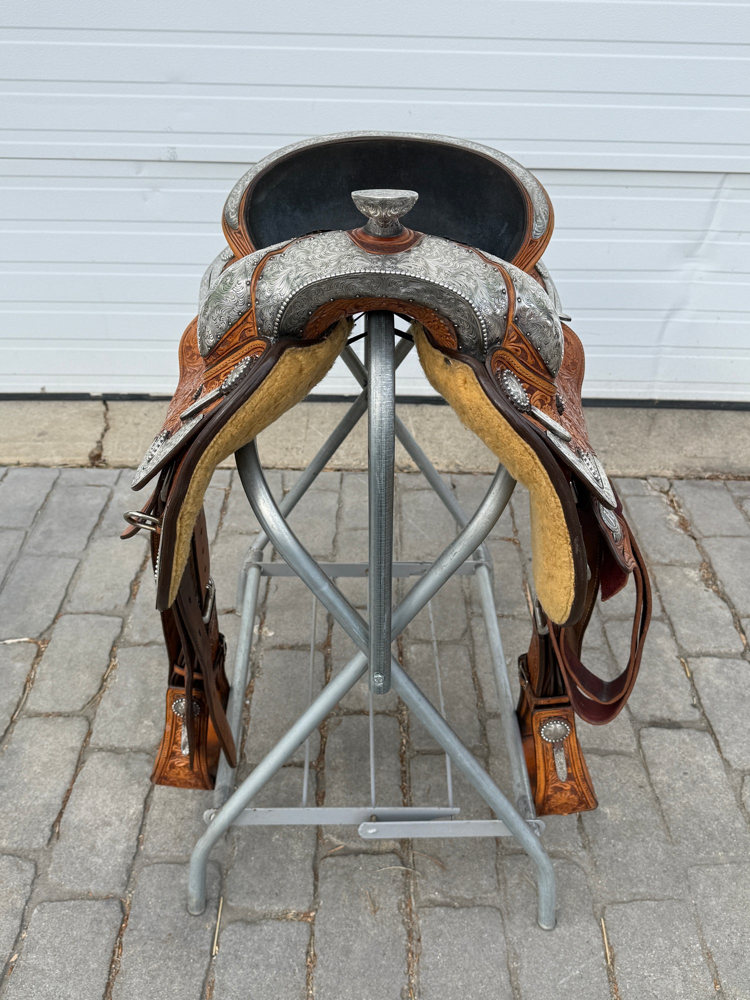 Beautiful Phil Harris custom Western Show Saddle with a 16" padded black suede seat. Saddle is originally light oil in color and features lots of silver. Saddle has eight corner plates with eight board plates trimming the corners. In addition is has three pommel plate including large front pommel plate, large cantle plate, and silver horn. Make a statement in the show pen with this fully hand tooled saddle. FQHB. Stamped with maker marks on fenders and underside of jockey along with maker plate on latigo keeper. Stamped 5320151909. Used, but in good condition. Saddle has normal wear on seat, stirrups, and fenders. Saddle may have marks from use and handling. Saddle has darkened from original color from use, time, light, and cleaning. Some areas may be darker than others. Silver may have area of tarnish. Please reference pictures for condition. Sold with Harris Saddle bag.