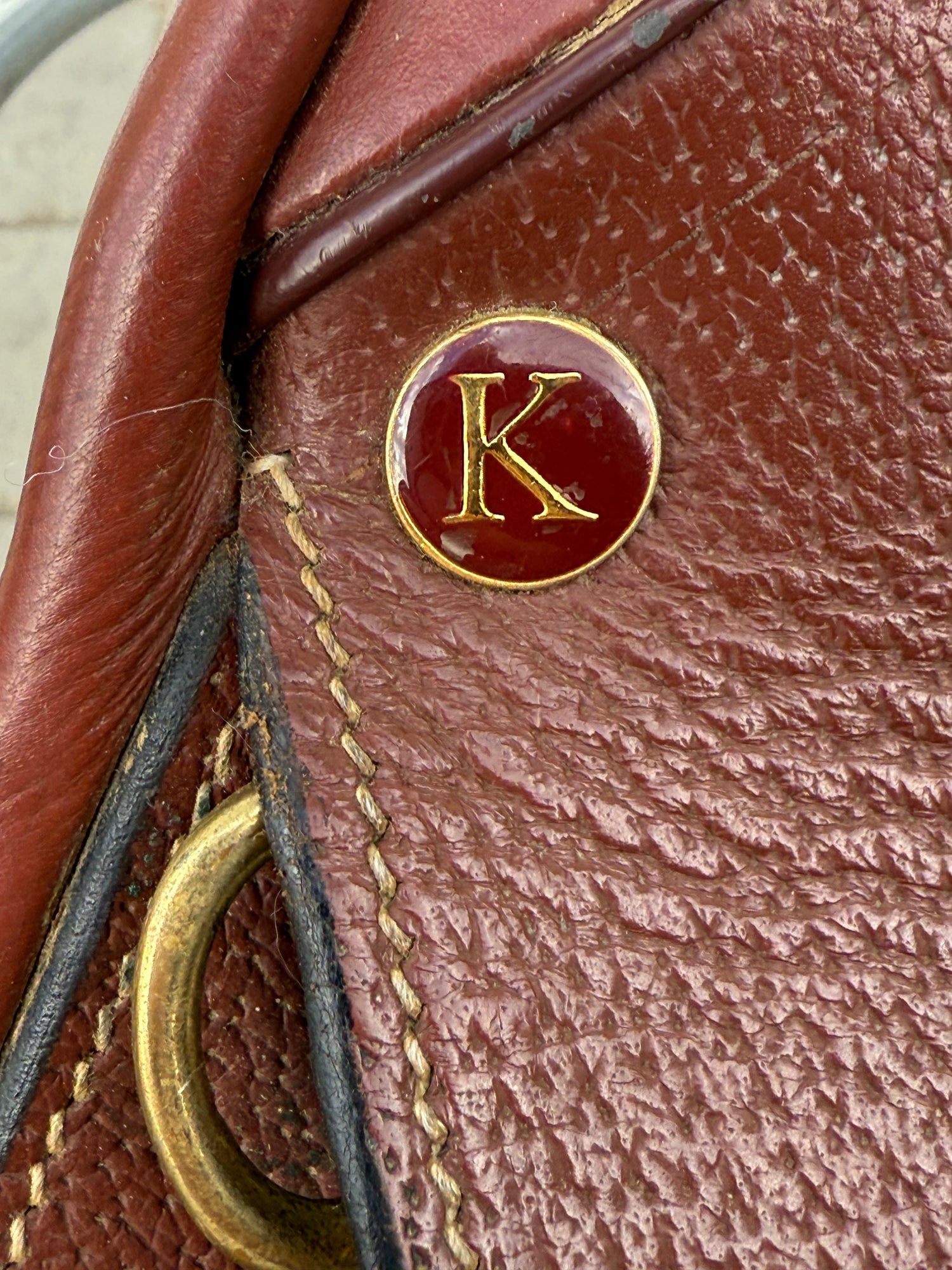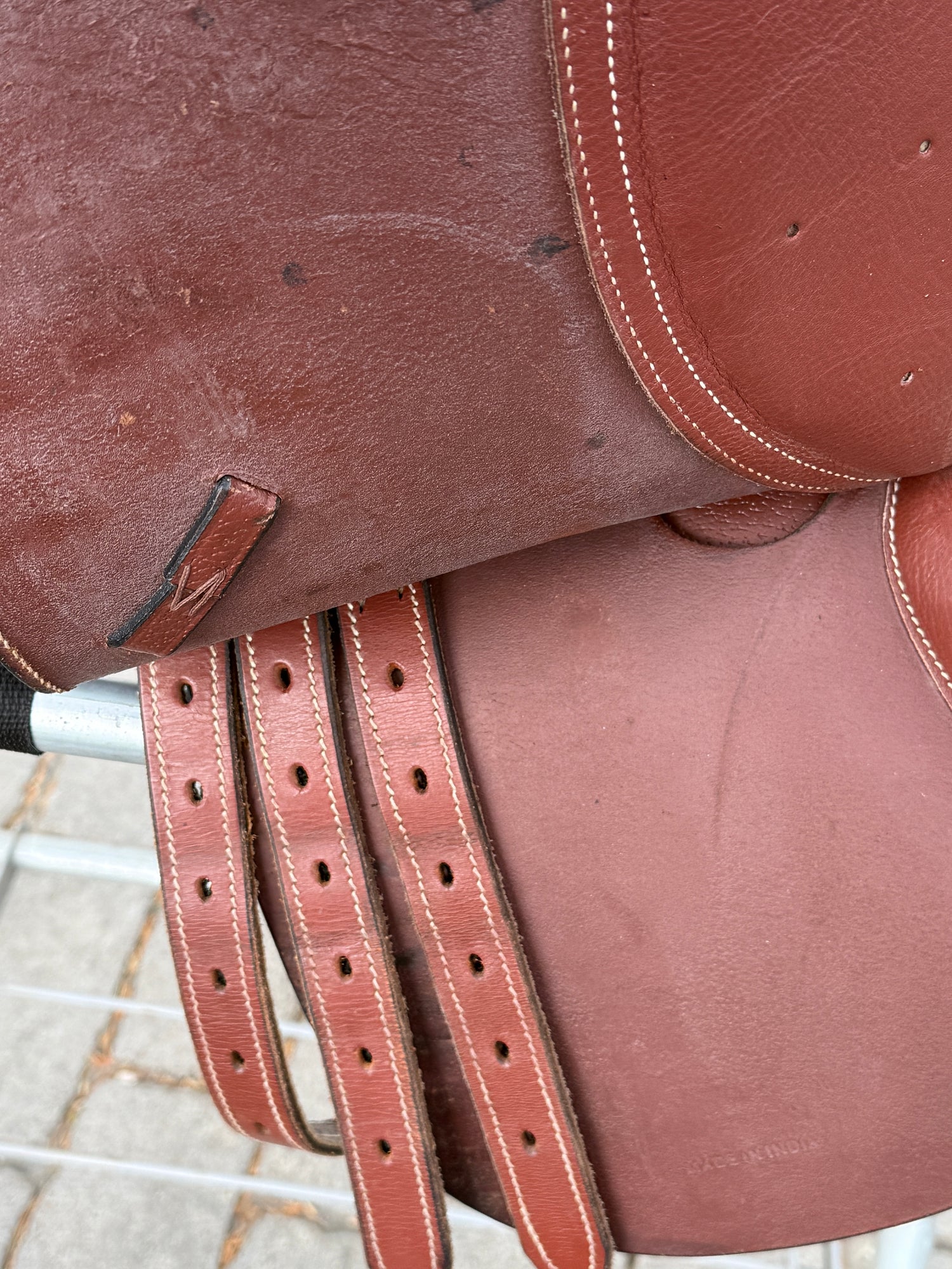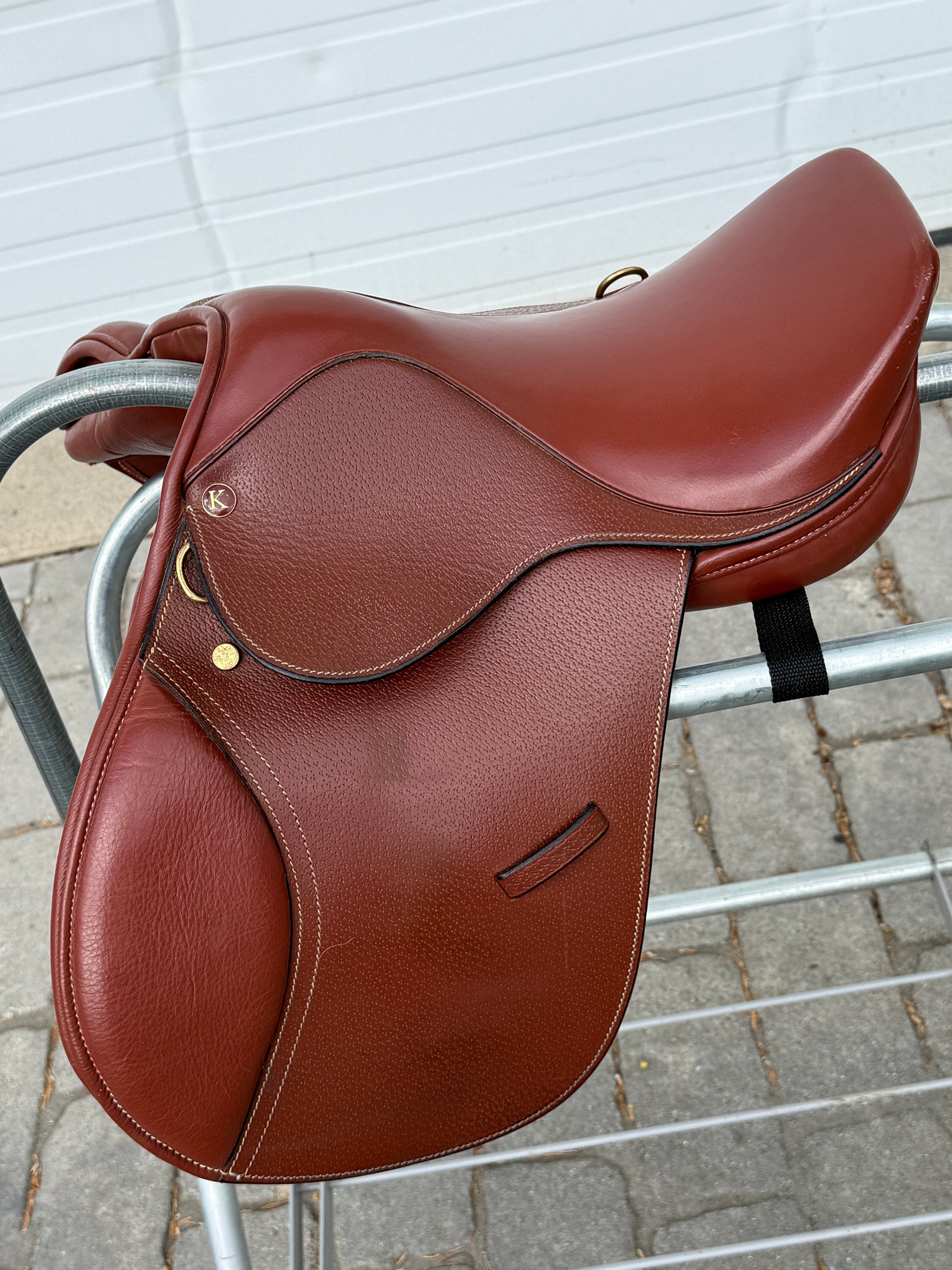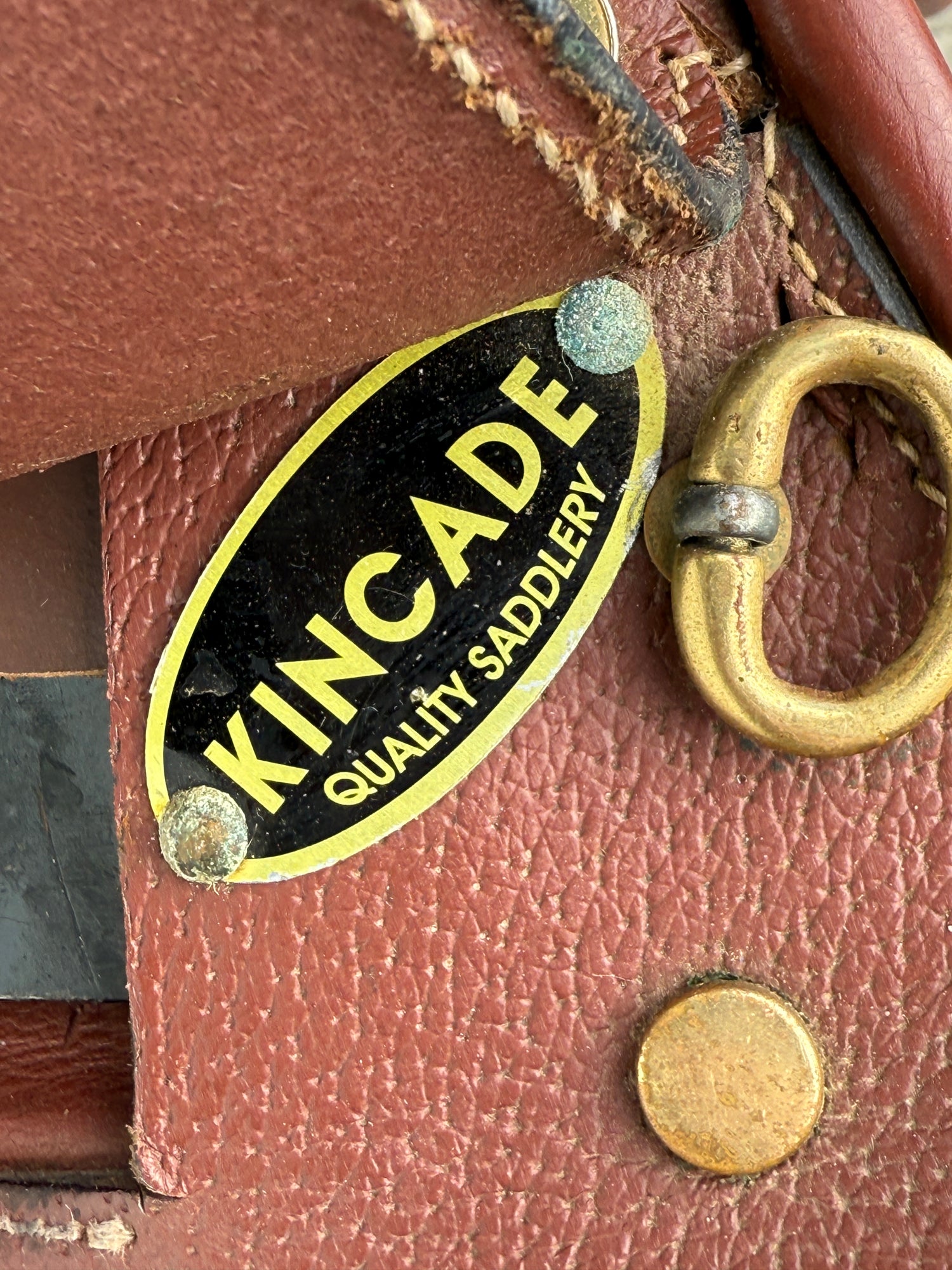 Kincade Child All Purpose/ Close Contact English Saddle with a 14" seat. Color is chestnut brown in color with brass hardware. Saddle features a padded knee flap with front knee blocks. Marked with maker plate. Sold with fleece saddle cover (no substitutions). Used, but in good condition. Saddle has little to normal wear on seat and flaps. Saddle has marks from use and handling. Saddle may have area that are darker from use, cleaning and time. Please reference pictures for condition.