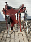 Cashel by Martin Western Trail Saddle with a 17" black leather seat. Saddle is built with the smoothout leather option in chocolate color. 6.5" gullet. Saddle is stamped under jockey flap with manufacture serial number. Used, but in Very Good Condition. Saddle has normal wear on seat, stirrups, and fenders. Saddle has marks from use and handling. Saddle may be slight darker in areas from use and cleaning. Please reference pictures for condition. Sold with Cinch (no substitutions).