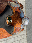 Beautiful Silver Mesa Western Custom Show Saddle. Stand out in the show pen with this saddle featuring lots of silver! This saddle has a 16" black suede seat and is fully tooled with a floral design. Embellished to shine with six corner plates, large cantle plate, four pommel plates, horn plate, and matching conchos. Lined with %100 wool. FQHB. Used, but in good condition. Saddle has normal wear on seat, stirrups, and fenders. Saddle has marks from use and handling. Saddle has darkened from original color from time, light, use, and cleaning. Some areas may be darker than others. Silver and hardware may have areas of tarnish. Please reference pictures for condition. Sold with saddle bag as pictured (no substitutions).