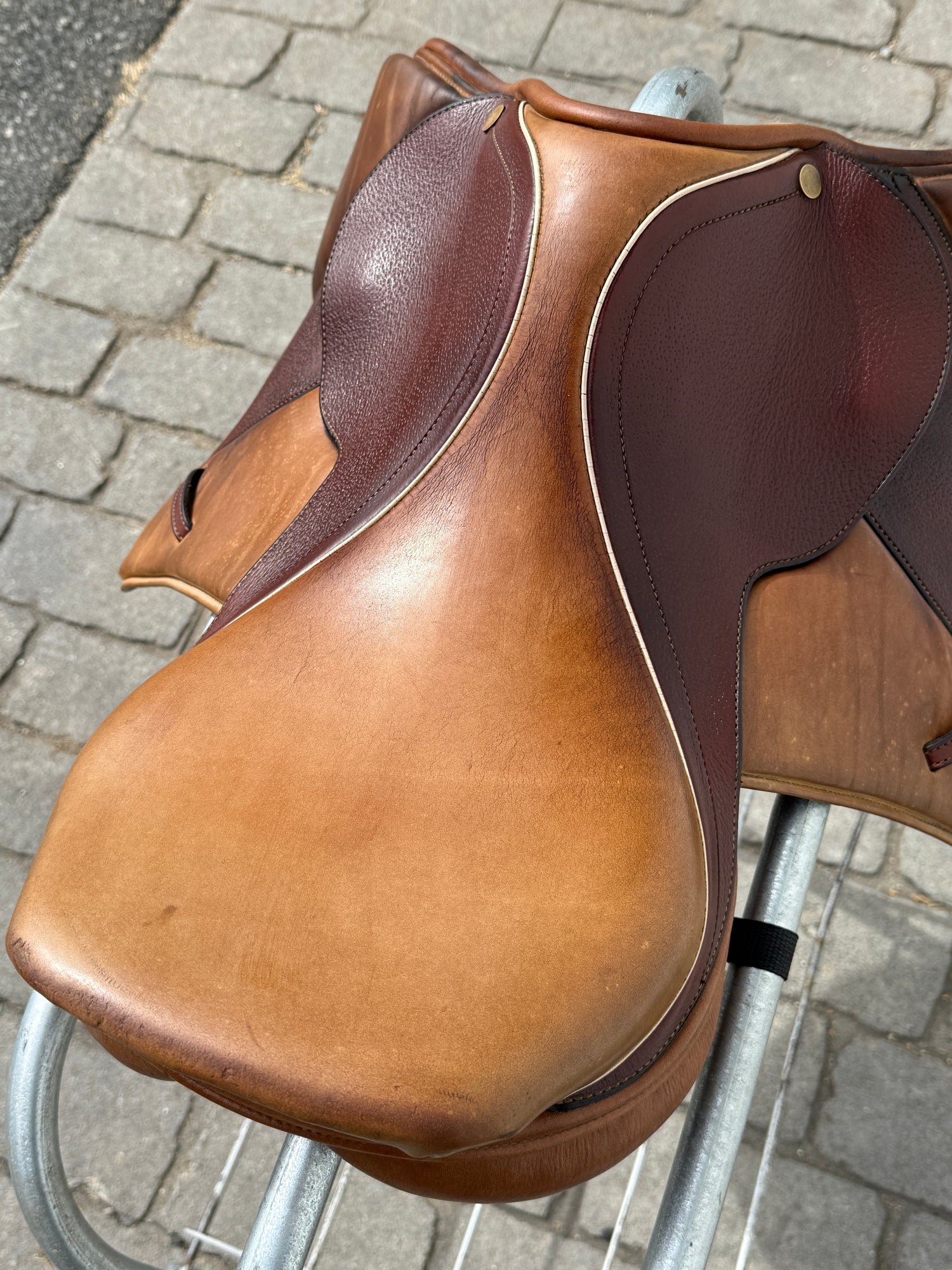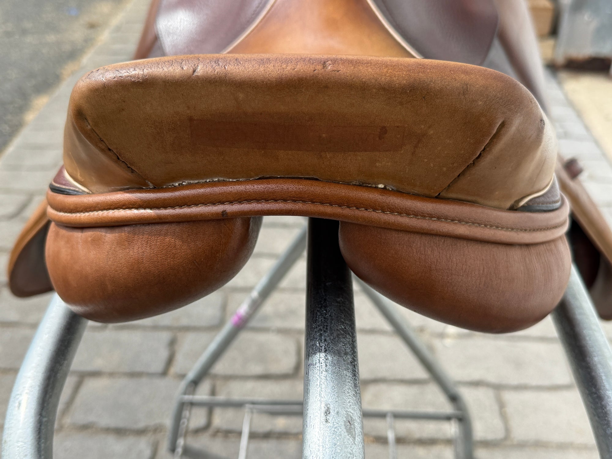 English all-purpose saddle with a 17.5" seat. Saddle is all leather and features a two-tone leather style. Saddle flaps have the medium oil with light accents on both sides along with a light leather seat to bring it all together. Saddle has padded knee flaps. Saddle has knee and thigh blocks. Saddle has no stamp marks that reference a maker. Used, but in good condition. Saddle has normal wear on seat and flaps. Saddle has marks from use and handling. Areas may be darker than others from use, cleaning, and time. Saddle has mark where name plate was. Normal stitching is coming loose where leg sits and rubs on leather on one side. Please reference pictures for condition.