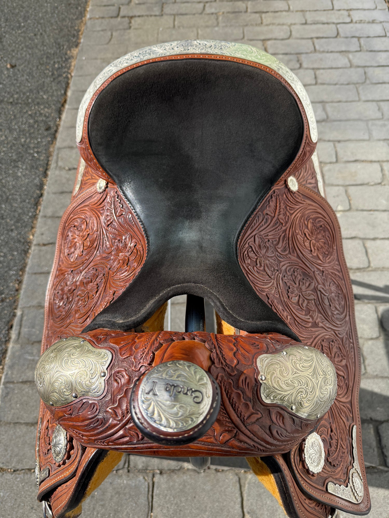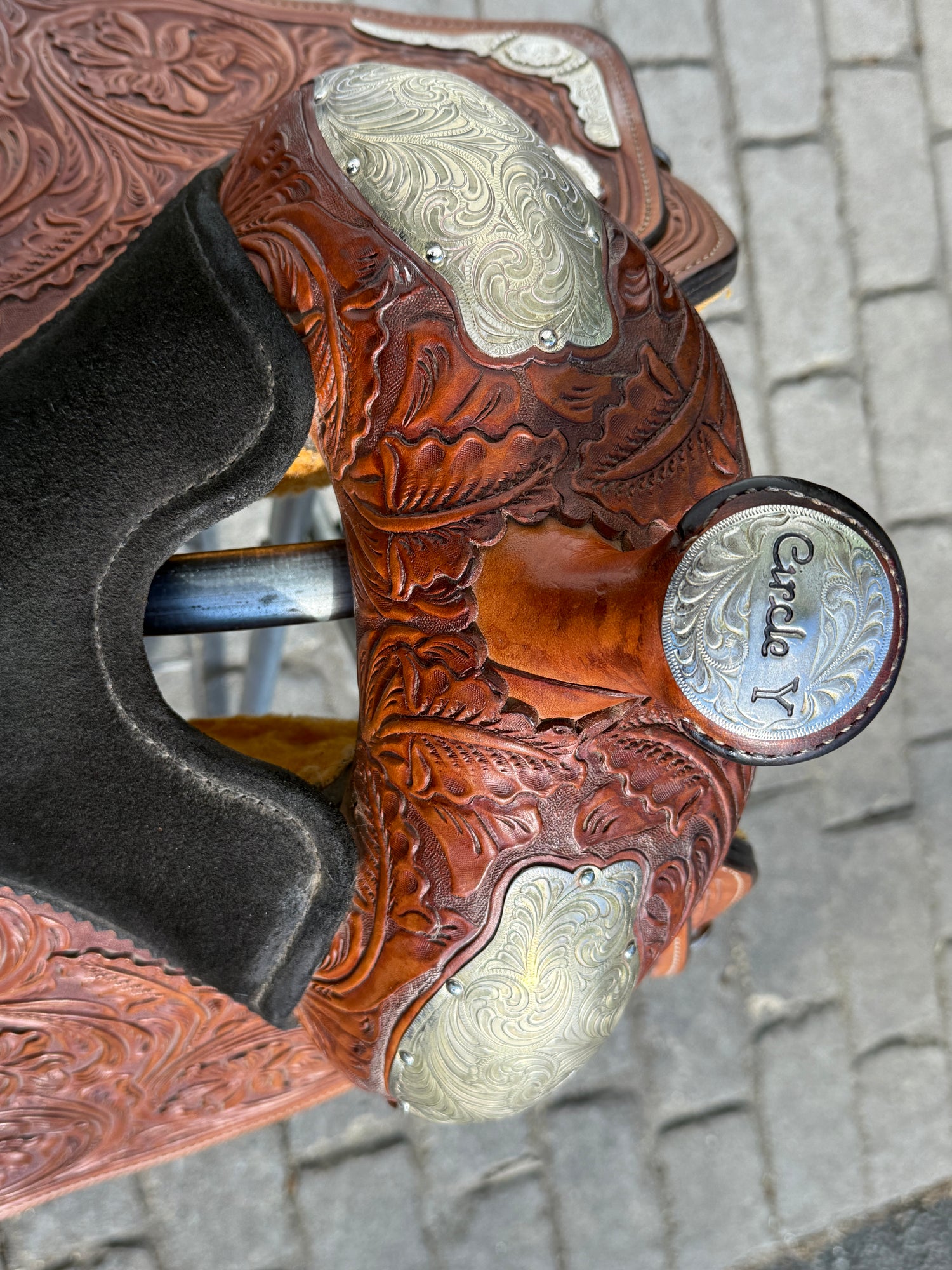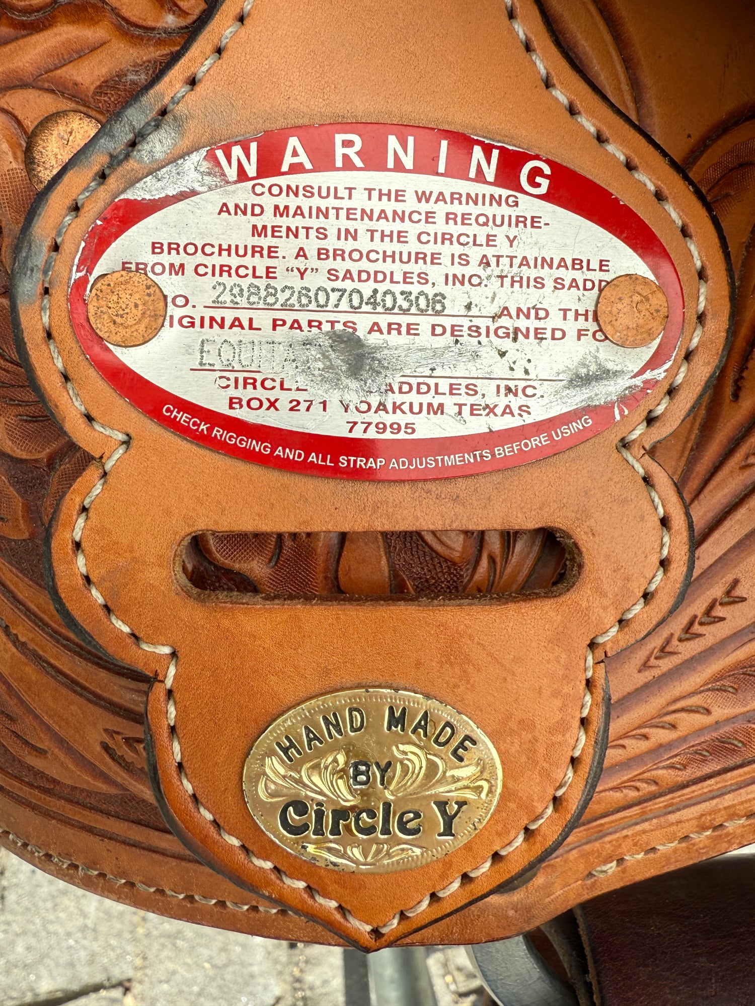 Circle Y Equitation Western show saddle with a 16" black suede seat. Saddle is Regular Oil in color. Saddle is fully tooled with a floral design. Saddle features six corner plates, large cantle plate, two pommel plates, and Circle Y horn plate. Saddle stamped with Circle Y logo on fenders as well as Circle Y plate under the jockey. Stamped 29882607040306 Equitation. Hand Made by Circle Y. Used, but in good condition. Saddle has normal wear on seat, fenders, and stirrups. Saddle has marks from use and handling. Saddle has darkened from original color from use, time, and cleaning. Silver may have areas of tarnish. Please reference pictures for condition.