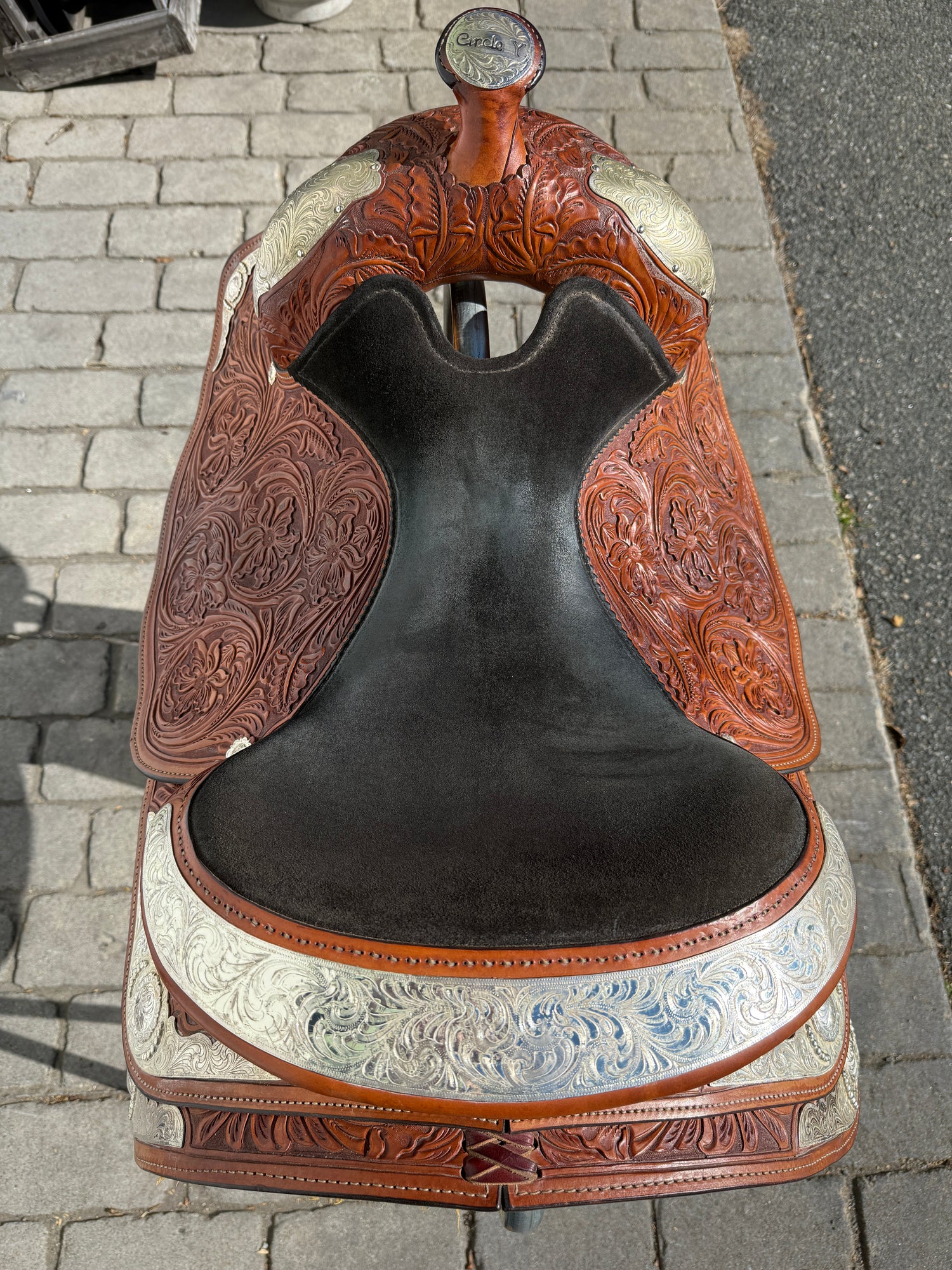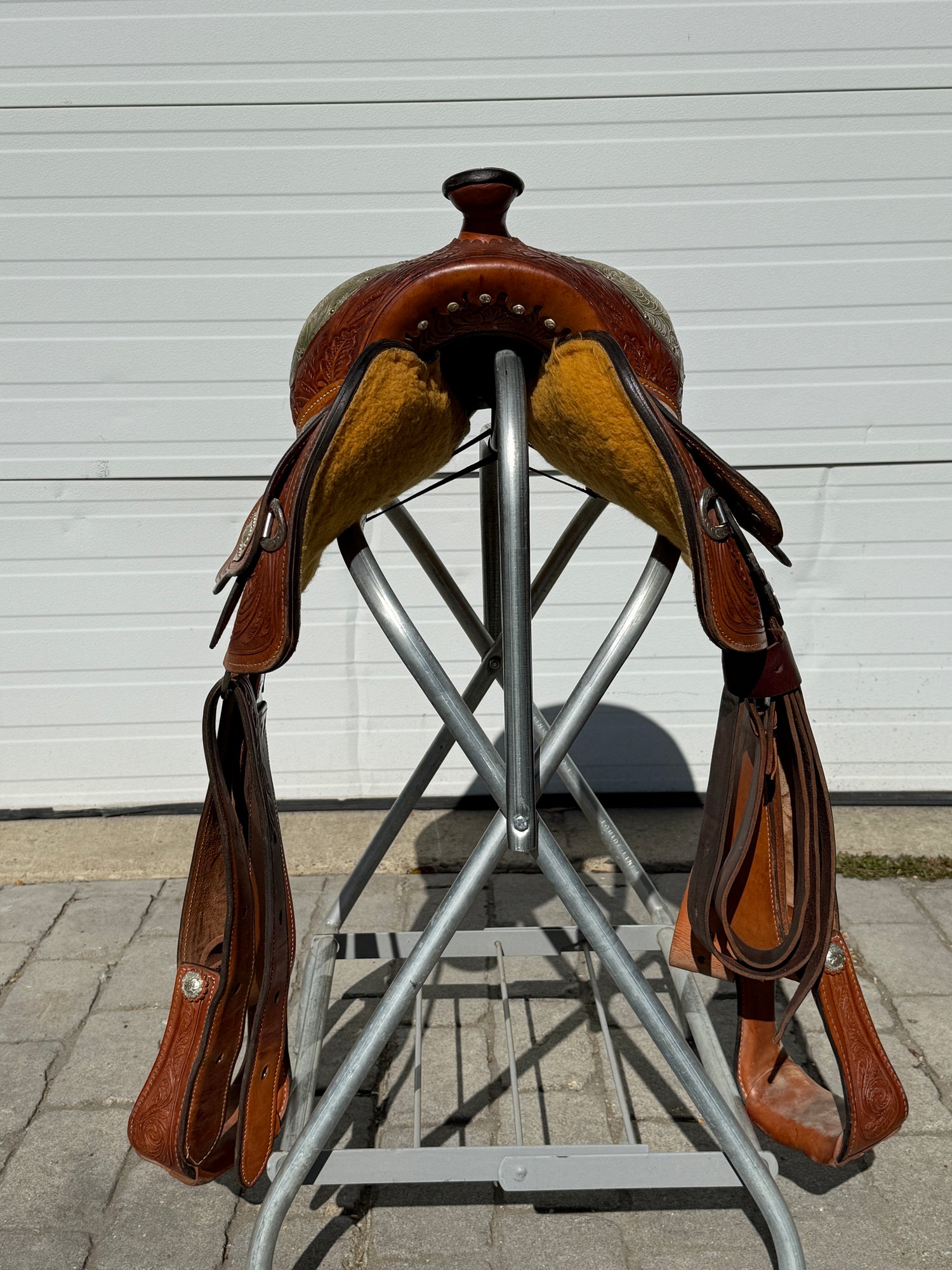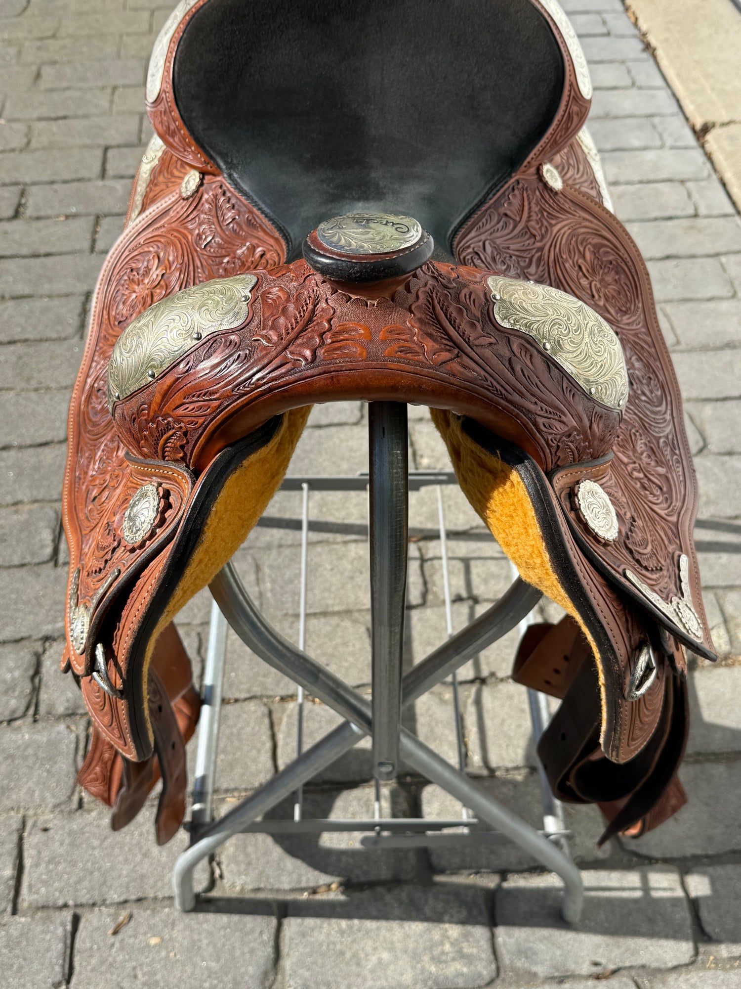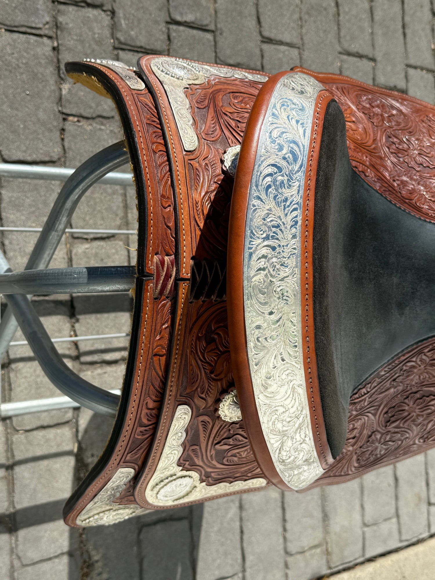 Circle Y Equitation Western show saddle with a 16" black suede seat. Saddle is Regular Oil in color. Saddle is fully tooled with a floral design. Saddle features six corner plates, large cantle plate, two pommel plates, and Circle Y horn plate. Saddle stamped with Circle Y logo on fenders as well as Circle Y plate under the jockey. Stamped 29882607040306 Equitation. Hand Made by Circle Y. Used, but in good condition. Saddle has normal wear on seat, fenders, and stirrups. Saddle has marks from use and handling. Saddle has darkened from original color from use, time, and cleaning. Silver may have areas of tarnish. Please reference pictures for condition.