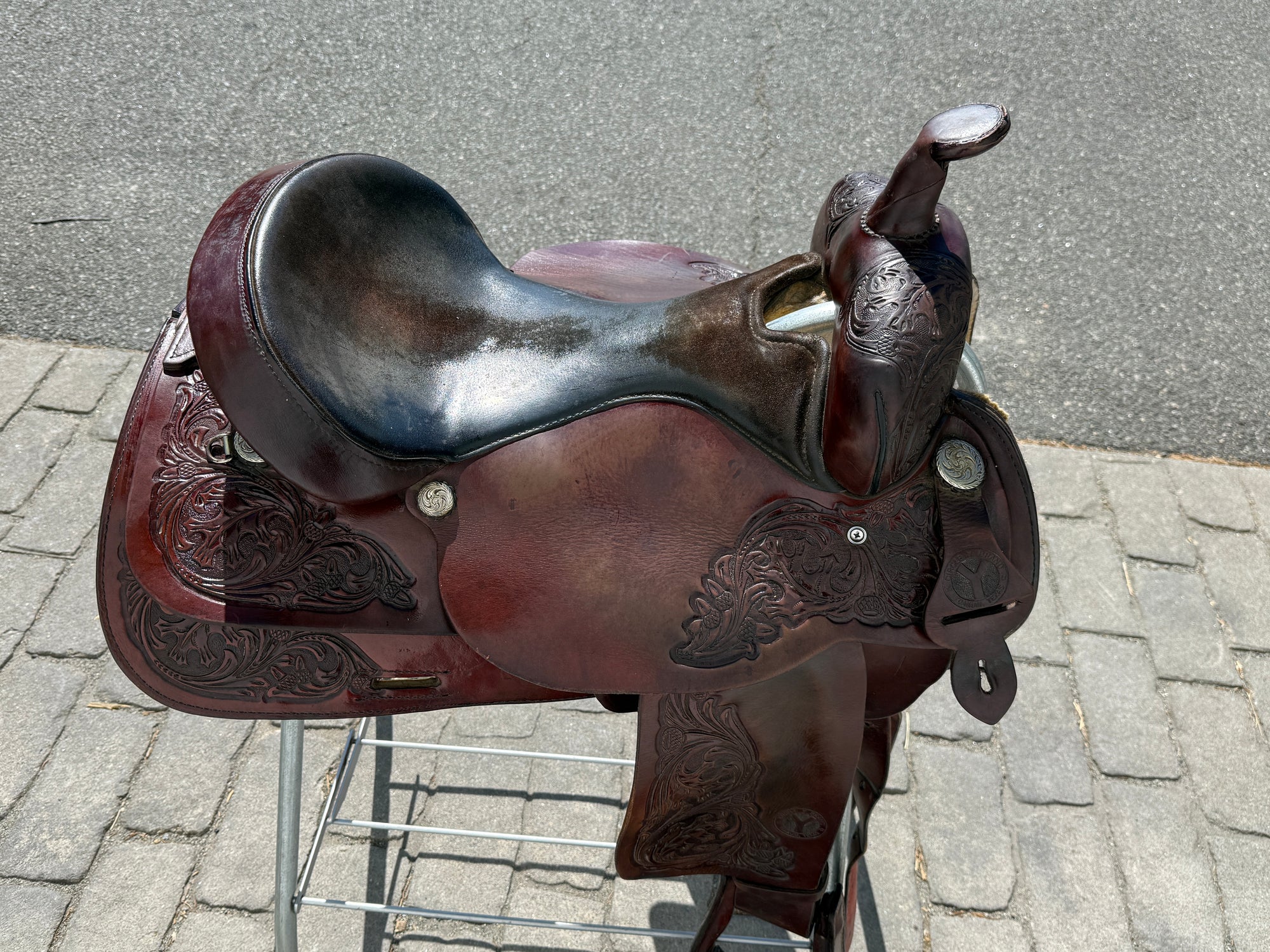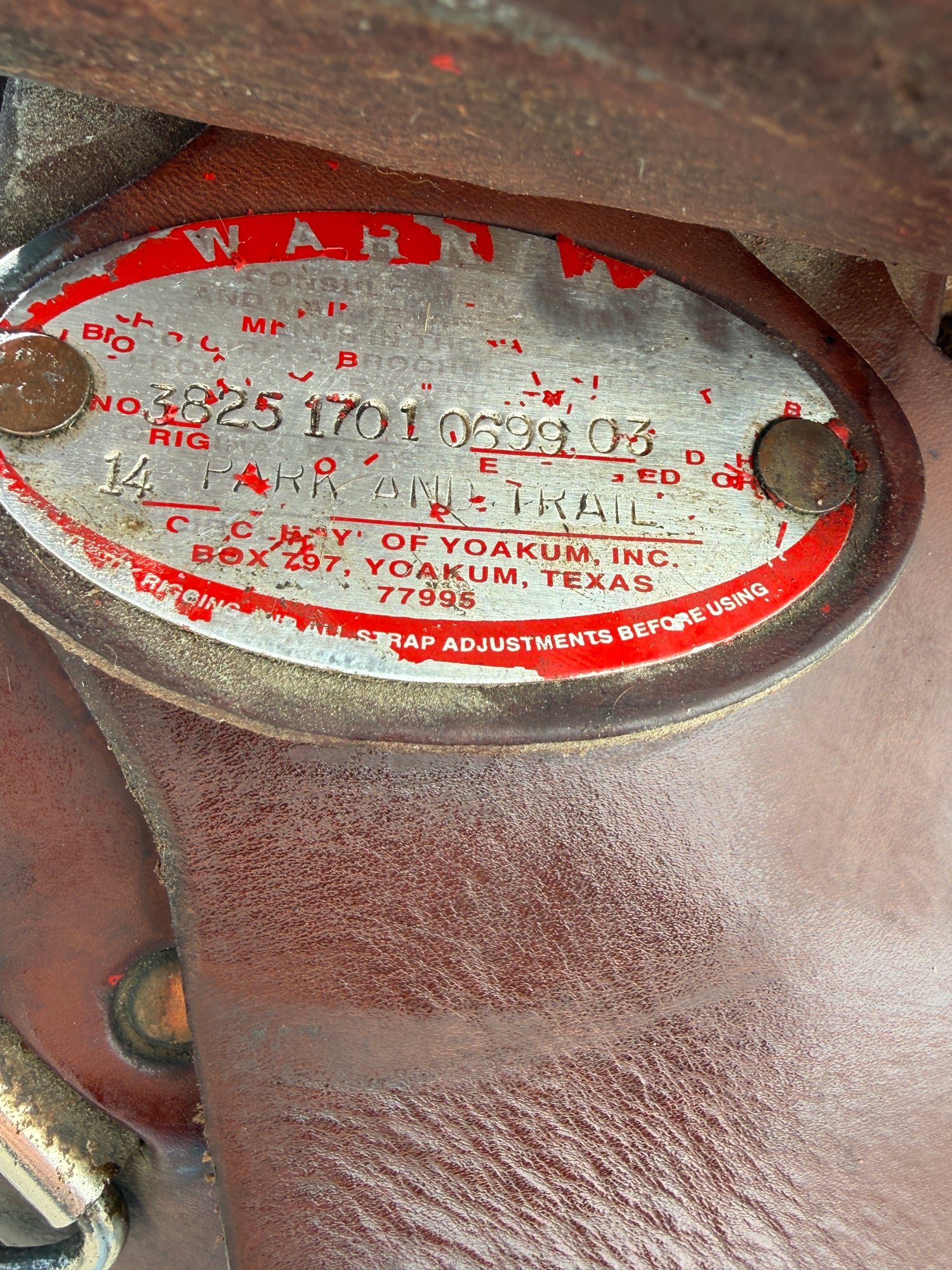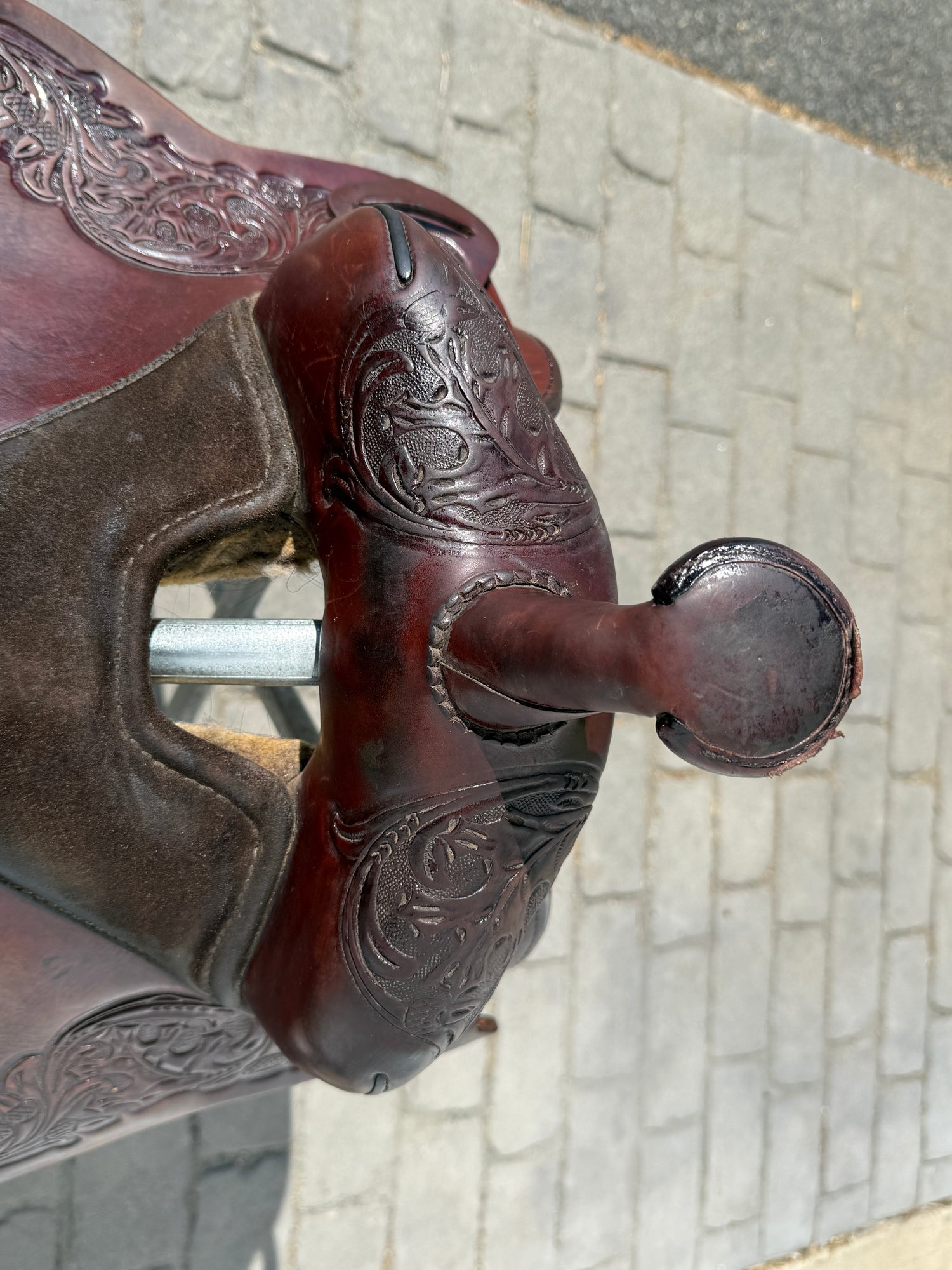 Circle Y Park & Trail Western Saddle with a 17" chocolate suede seat. Saddle is walnut in color. Saddle features partial floral tooling. Saddle is stamped with Circle Y logo on fenders, skirt, and keepers. Saddle is stamped with Circle Y plate and is stamped under the jockey. Stamped 3825 1701 069903. Used, but in good condition. Saddle has normal wear on seat, stirrups, and fenders. Saddle has marks from use and handing. Horn has some wearing. Hardware may have tarnish from use, time, cleaning. Some areas may be lighter or darker in color from use, time, lighting, and cleaning. Please reference pictures for condition.