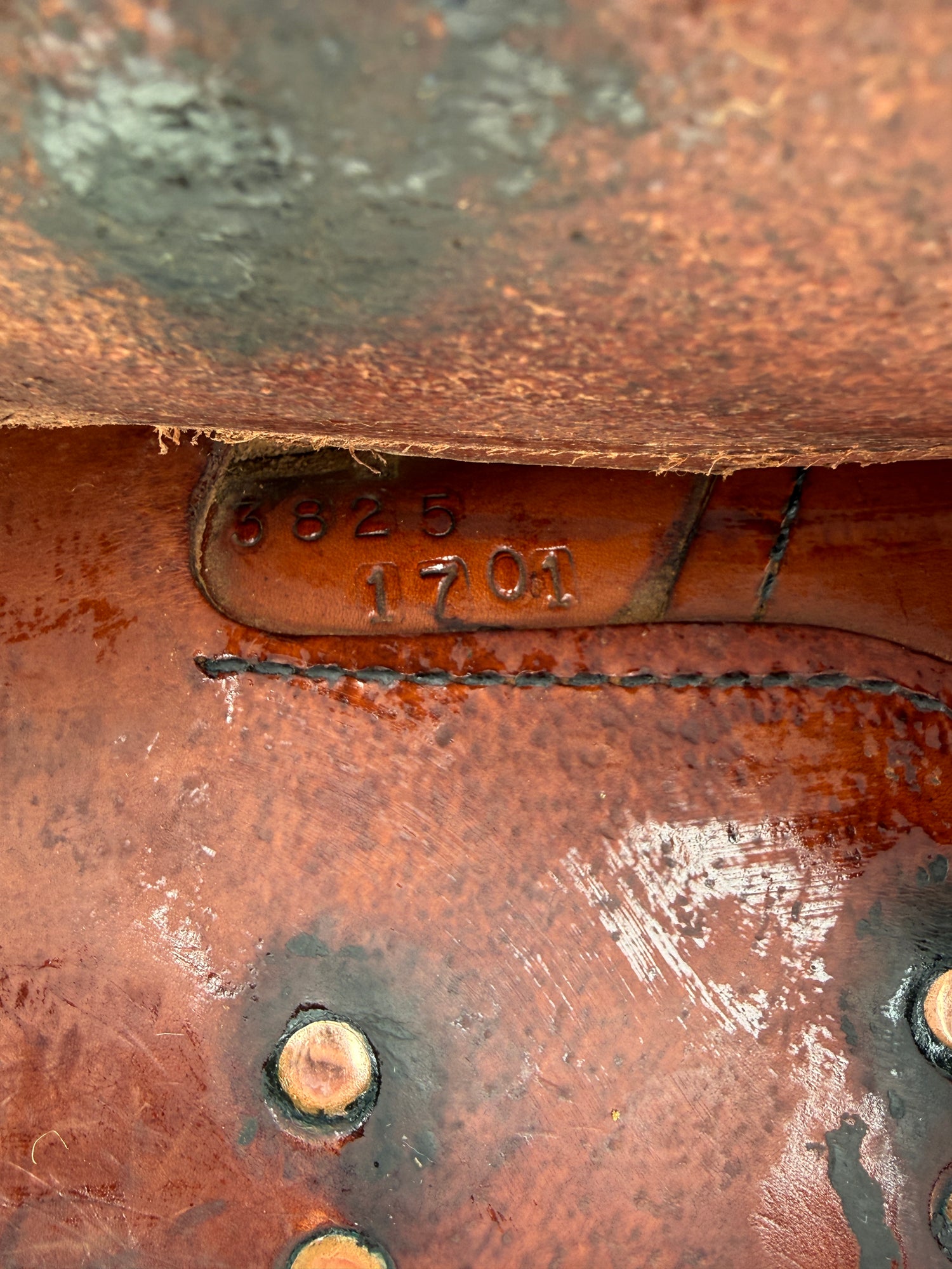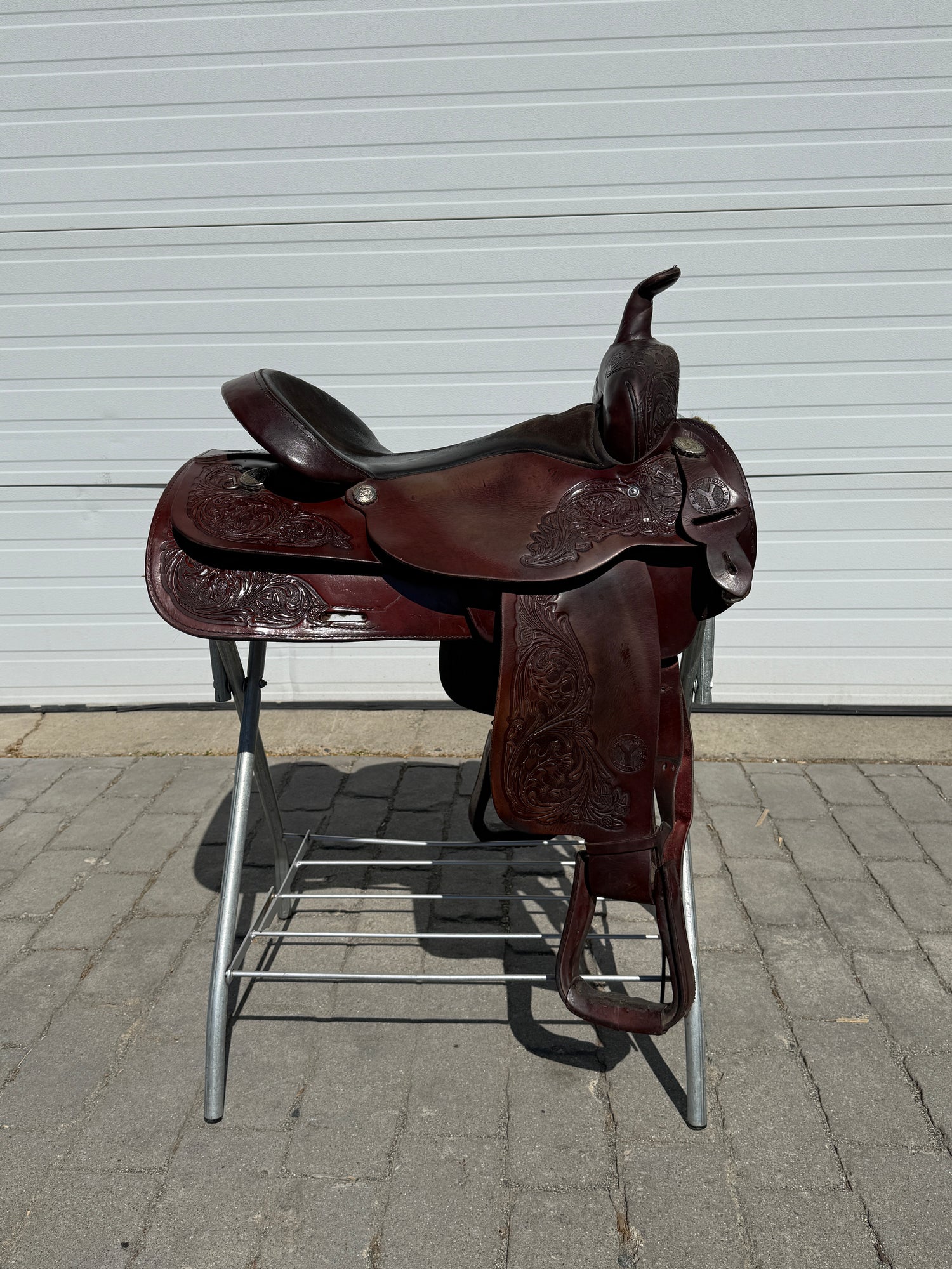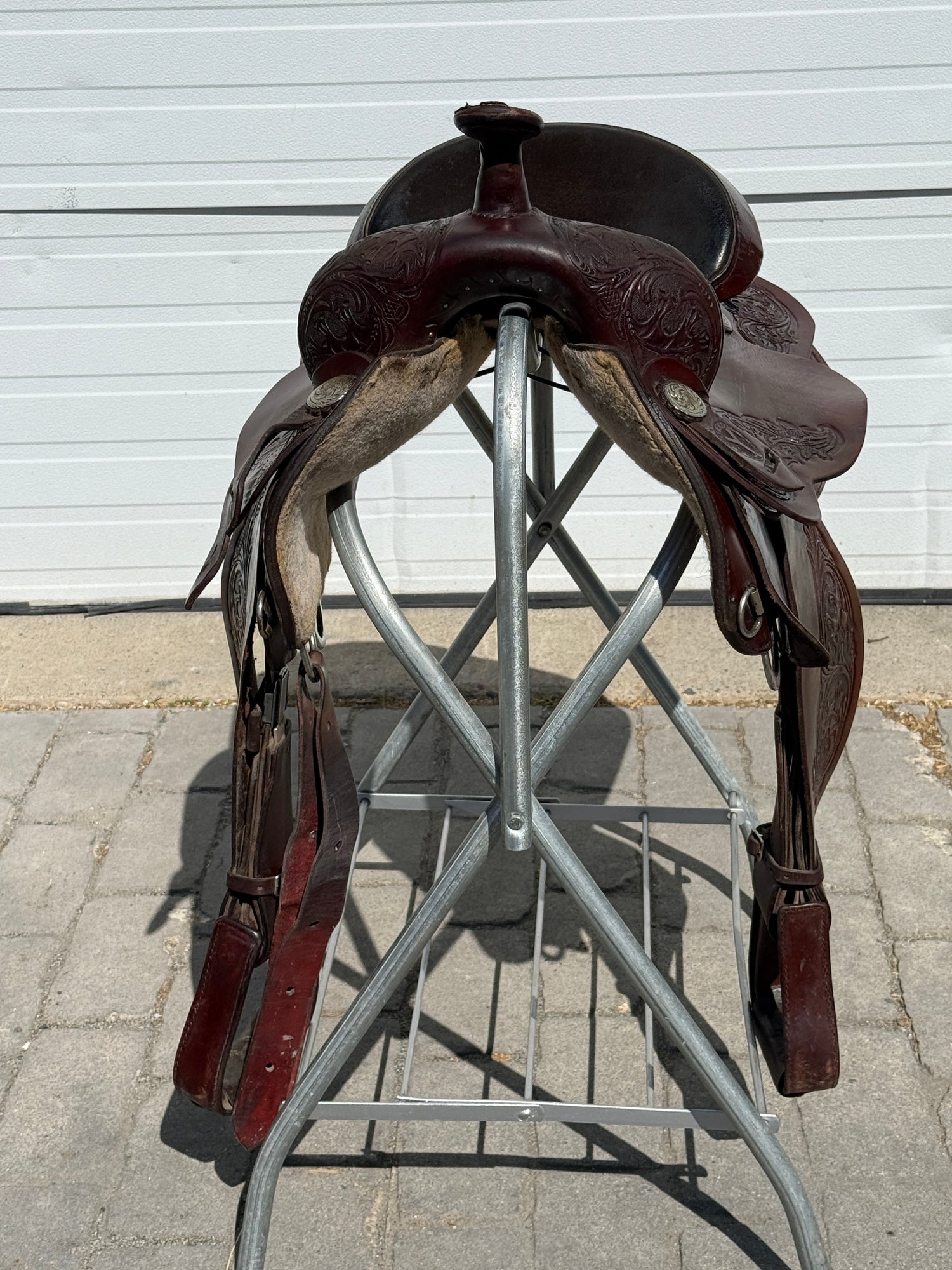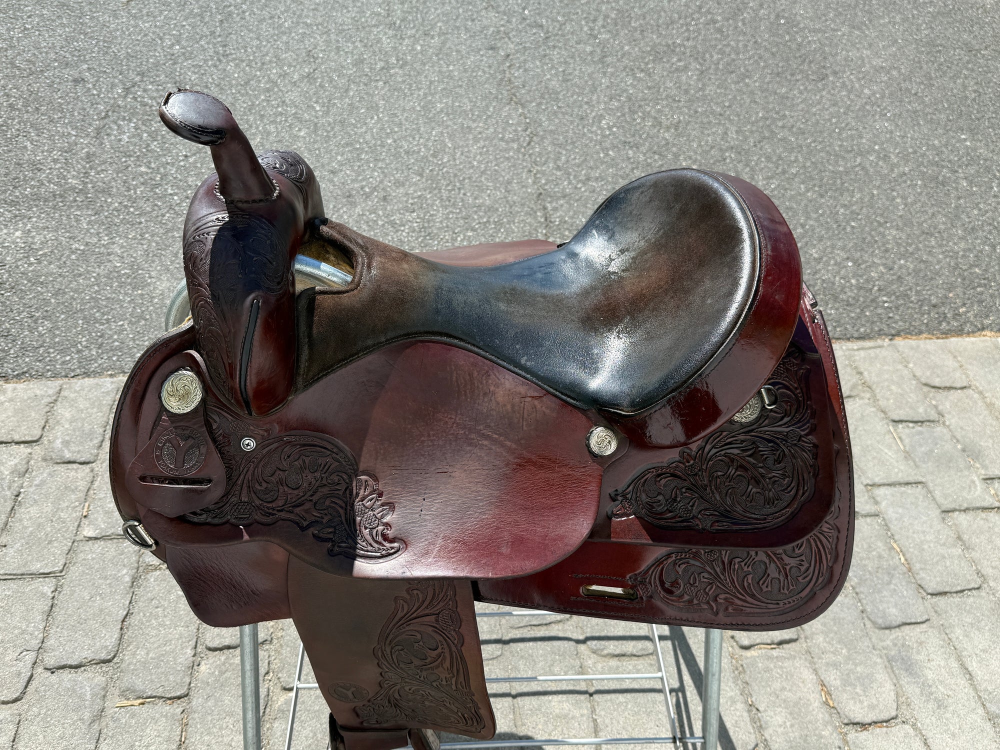 Circle Y Park & Trail Western Saddle with a 17" chocolate suede seat. Saddle is walnut in color. Saddle features partial floral tooling. Saddle is stamped with Circle Y logo on fenders, skirt, and keepers. Saddle is stamped with Circle Y plate and is stamped under the jockey. Stamped 3825 1701 069903. Used, but in good condition. Saddle has normal wear on seat, stirrups, and fenders. Saddle has marks from use and handing. Horn has some wearing. Hardware may have tarnish from use, time, cleaning. Some areas may be lighter or darker in color from use, time, lighting, and cleaning. Please reference pictures for condition.