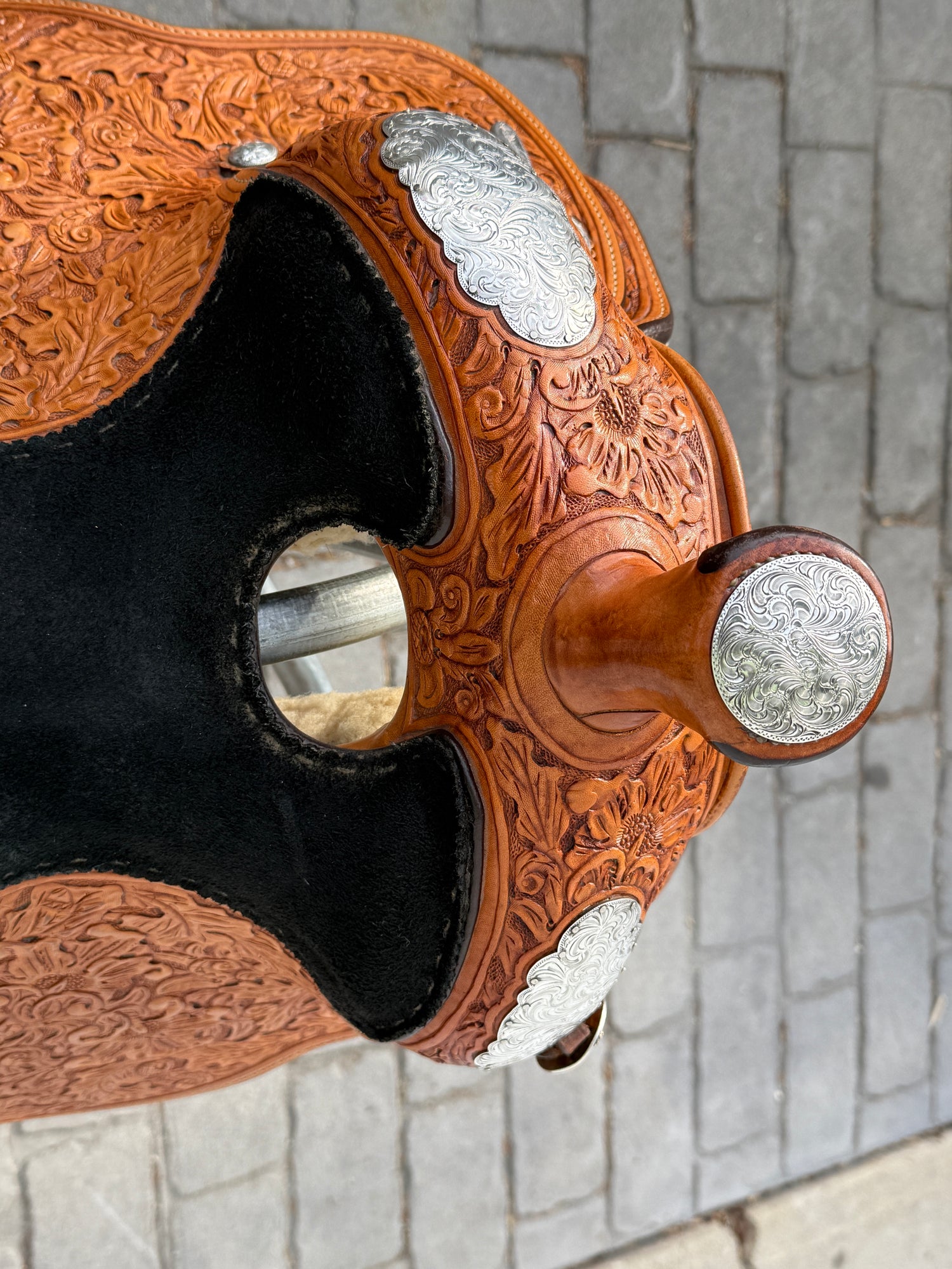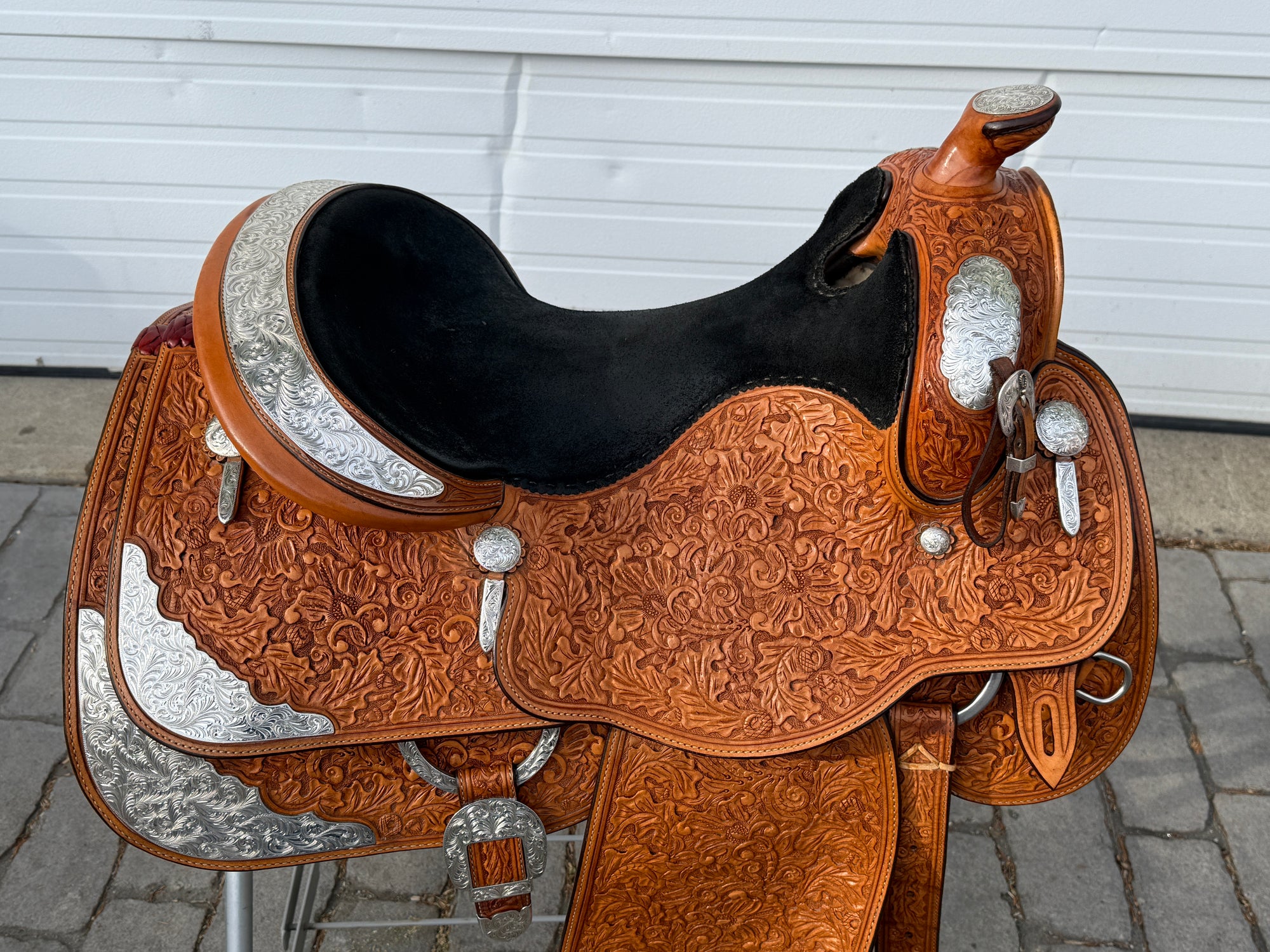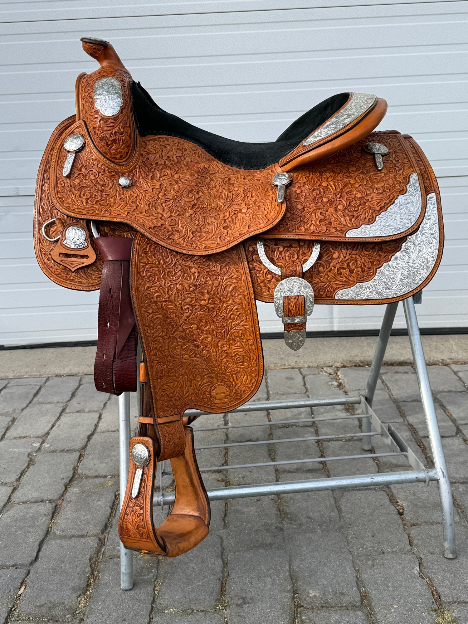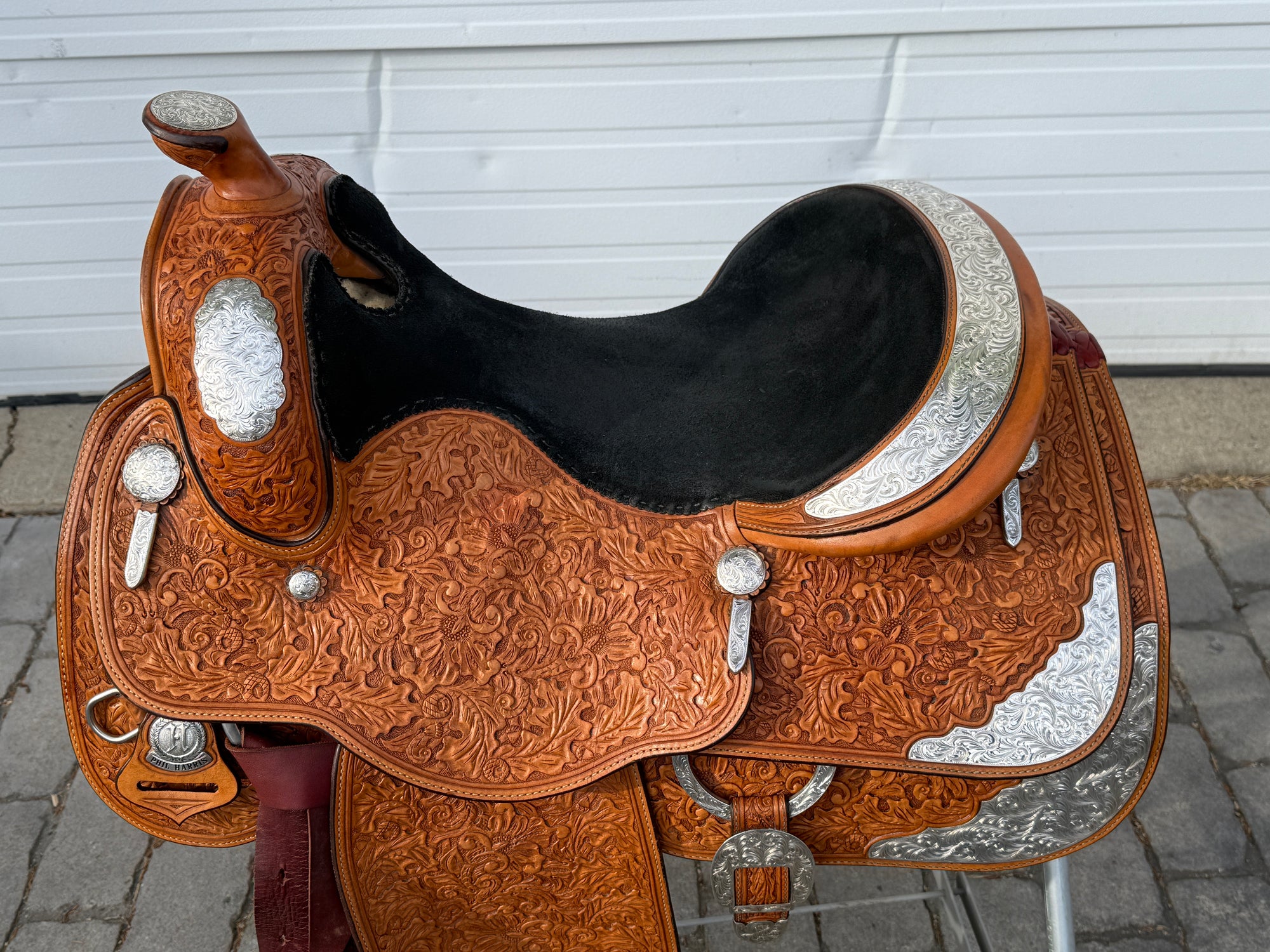 Phil Harris Western Show Saddle with a 16" black suede seat. Don't miss out on this beautiful classic western show saddle featuring four corner plates, three pommel plates, a horn plate, large cantle plate, and matching conchos. Originally light oil color, this saddle is fully hand tooled with a floral leaf pattern. FQHB. Sold with saddle bag as pictured. Stamped with maker tag on latigo keeper and stamped with maker on underside of jockey. Stamped 5329460179. Used, but in good condition. Saddle has normal wear on seat, stirrups, and fenders. Saddle may have marks from use and handling. Saddle has darkened from original color from use, time, and cleaning. Some areas may be darker than others. Silver may have areas of tarnish from use and time. Please reference pictures for condition.