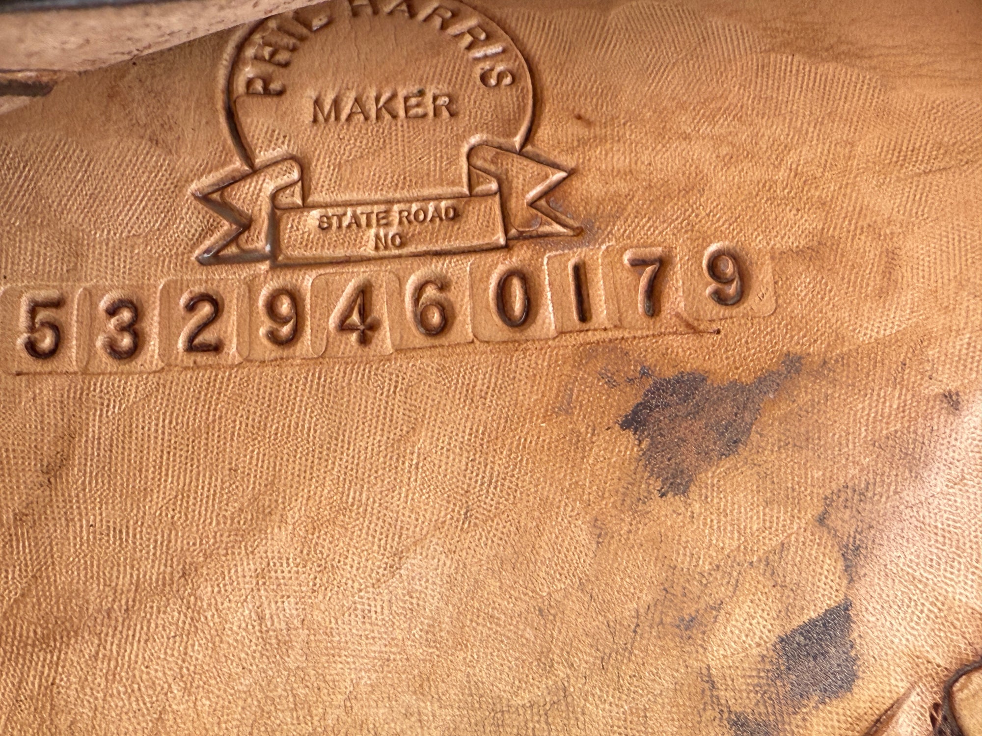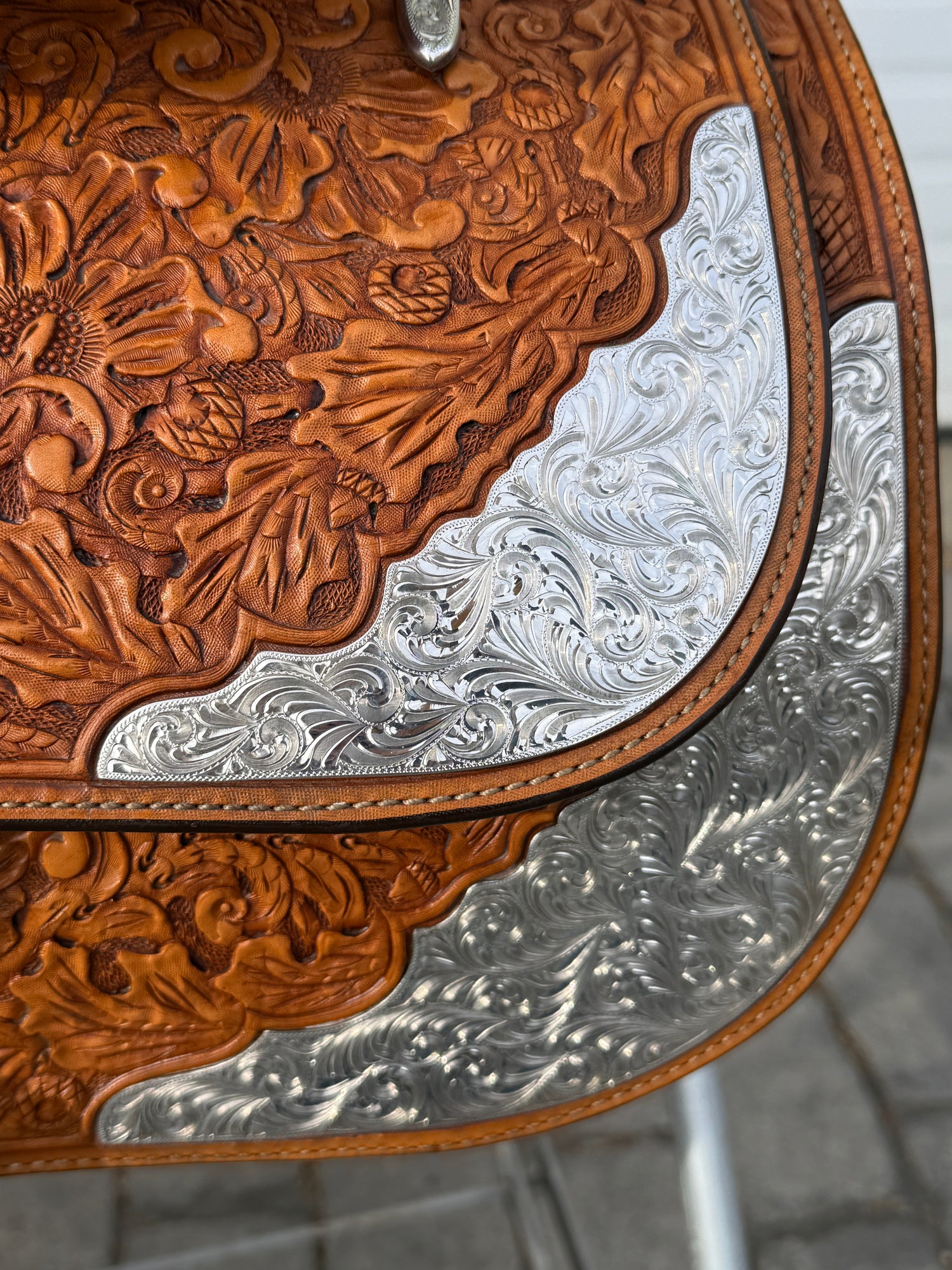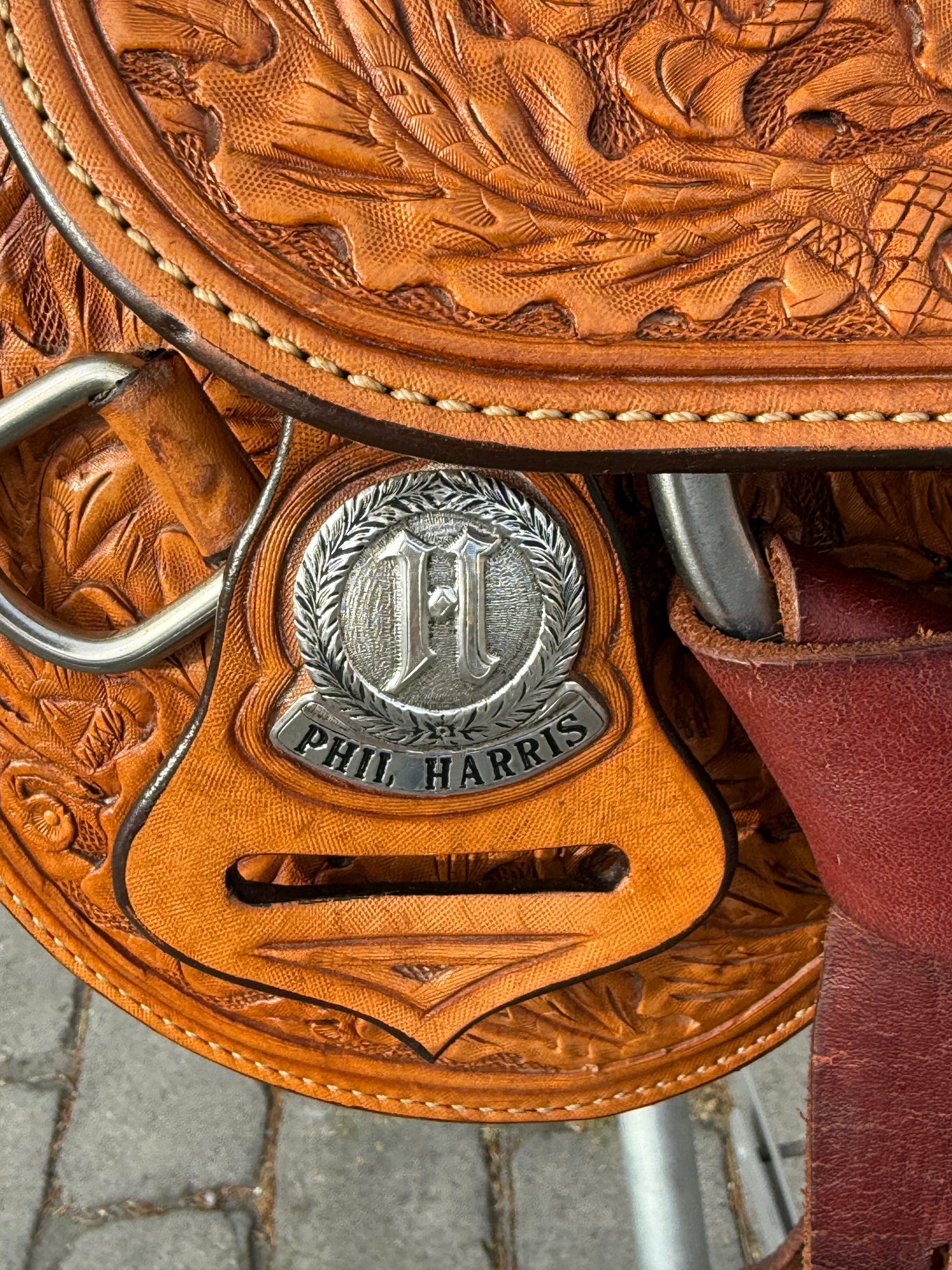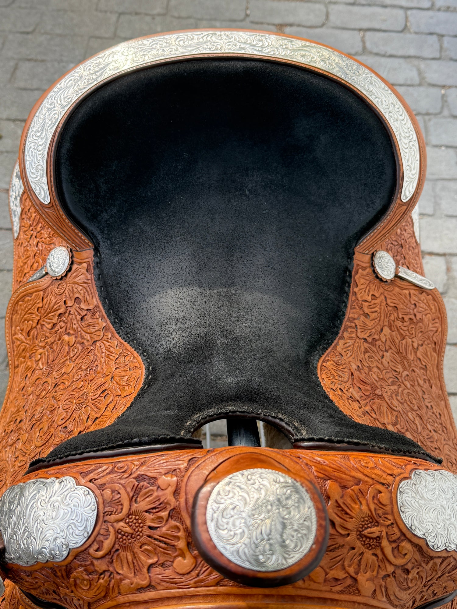 Phil Harris Western Show Saddle with a 16" black suede seat. Don't miss out on this beautiful classic western show saddle featuring four corner plates, three pommel plates, a horn plate, large cantle plate, and matching conchos. Originally light oil color, this saddle is fully hand tooled with a floral leaf pattern. FQHB. Sold with saddle bag as pictured. Stamped with maker tag on latigo keeper and stamped with maker on underside of jockey. Stamped 5329460179. Used, but in good condition. Saddle has normal wear on seat, stirrups, and fenders. Saddle may have marks from use and handling. Saddle has darkened from original color from use, time, and cleaning. Some areas may be darker than others. Silver may have areas of tarnish from use and time. Please reference pictures for condition.