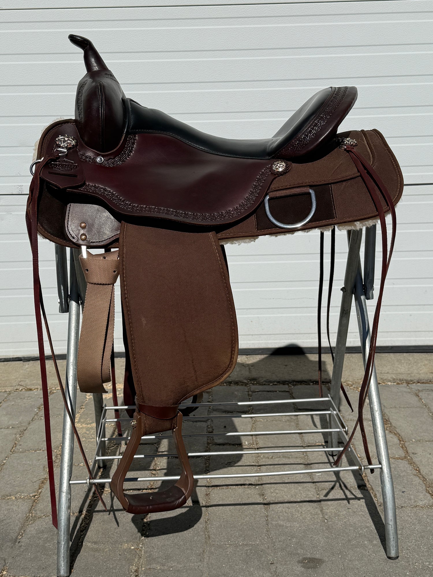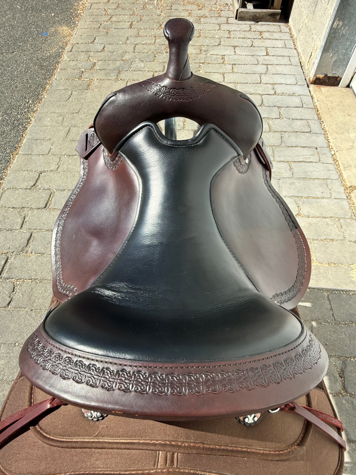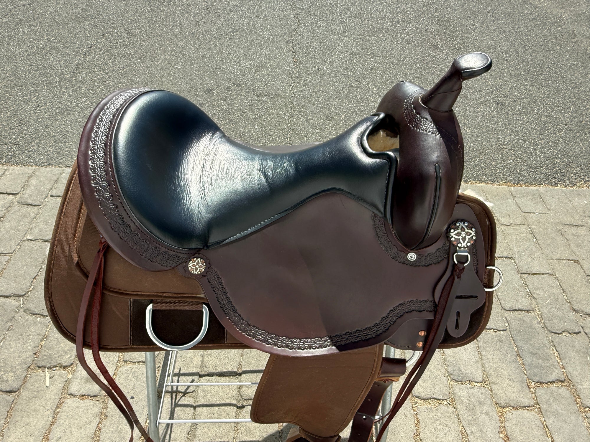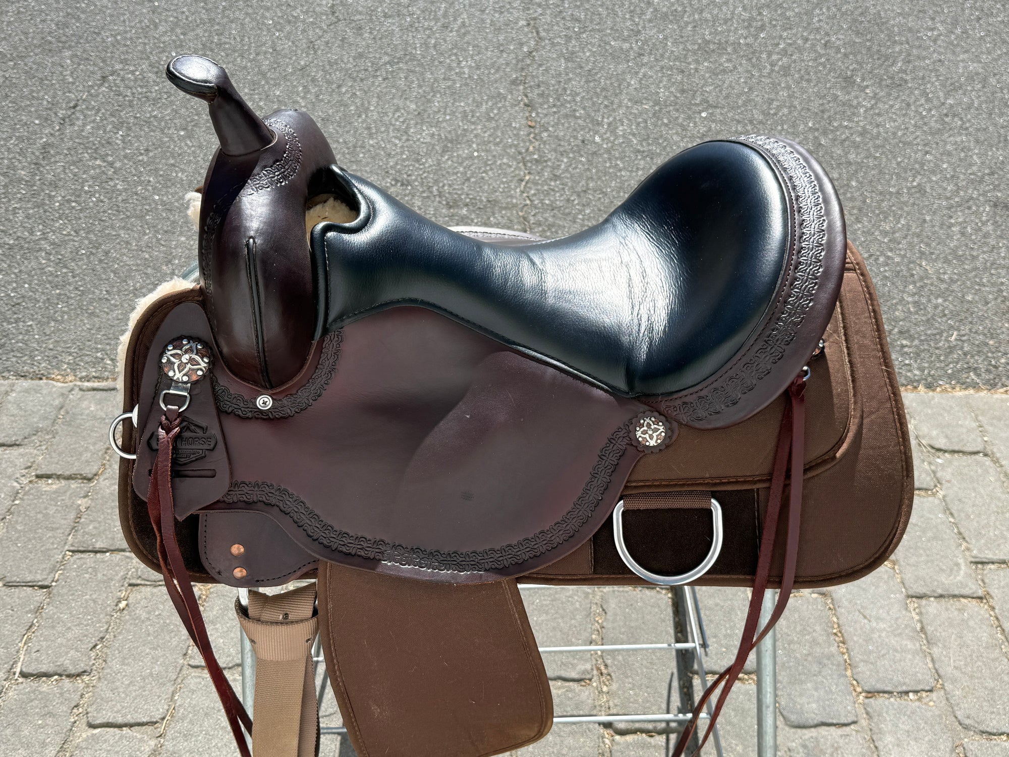 High Horse by Circle Y Magnolia Western Trail Saddle #6909 with a 17" black grainout seat. Walnut color finish. Saddle has a wide tree. Saddle stamped on Circle Y plate 6909-1701-05. Used, but in very good condition. Saddle has little to normal wear on seat, stirrups and fenders. Saddle may have marks from use and handling. Hardware may have areas of tarnish. Areas may be darker than others from use, cleaning, and time. Please reference pictures for condition.